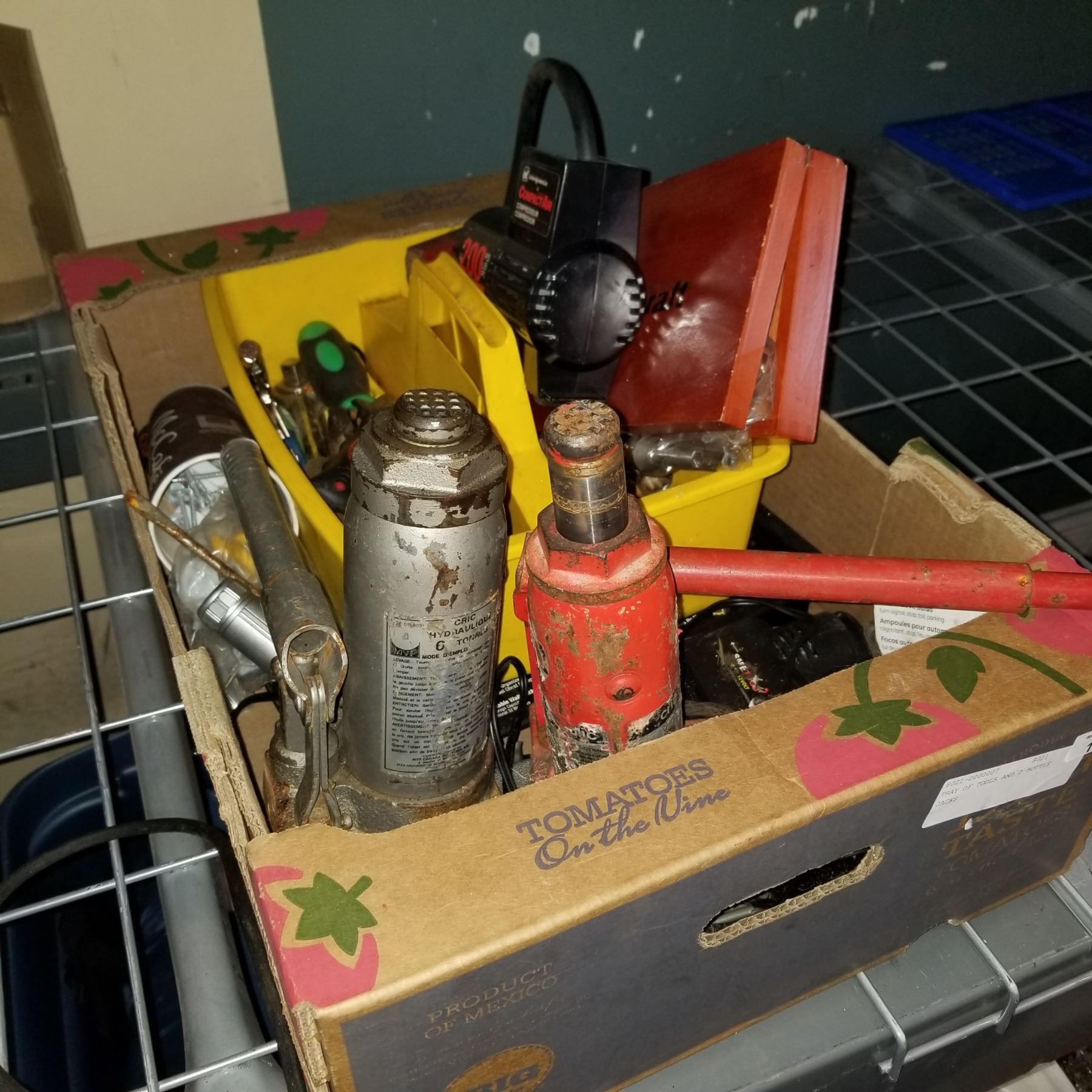 TRAY OF TOOLS AND 2 BOTTLE JACKS