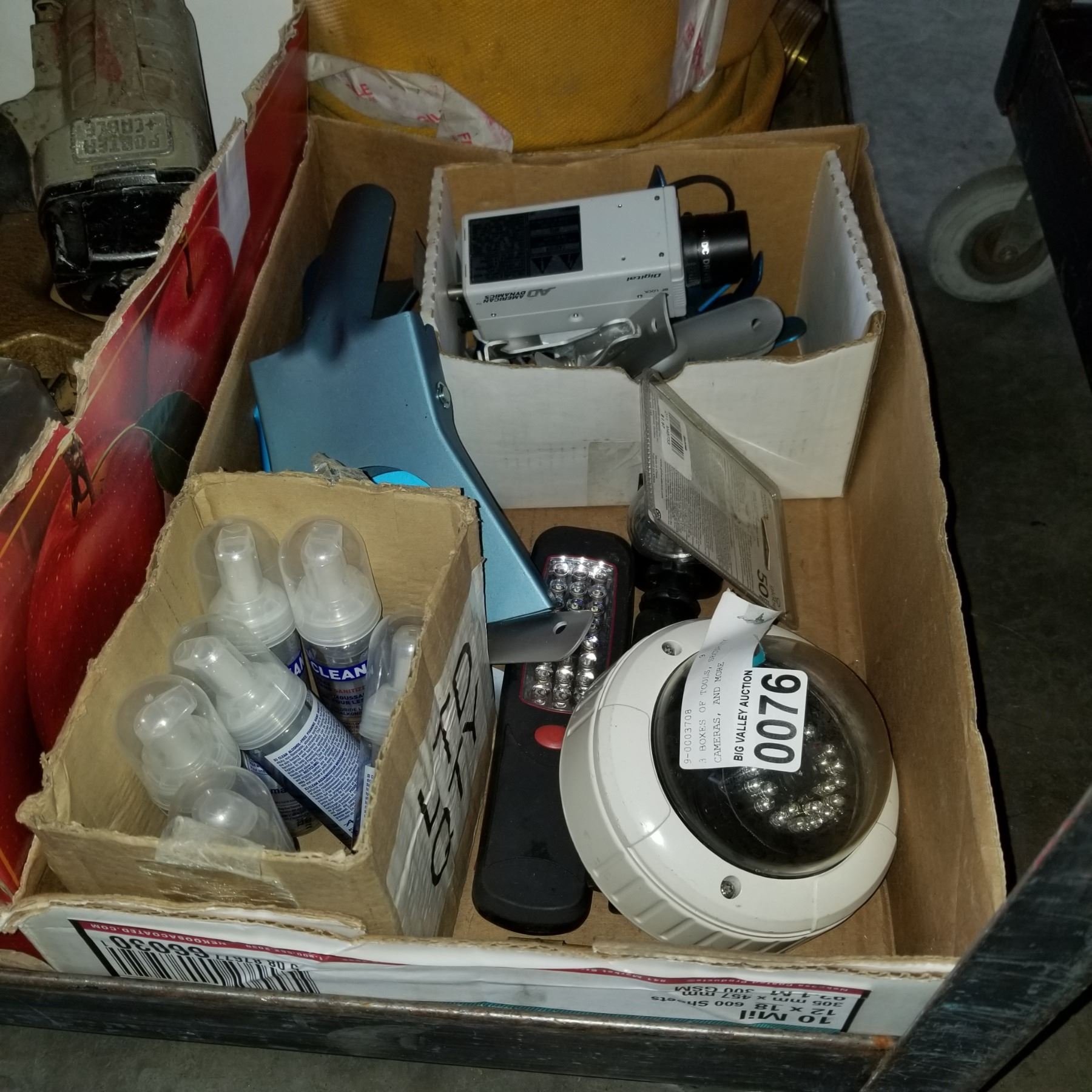 TRAY OF TOOLS, SECURITY CAMERAS, AND MORE