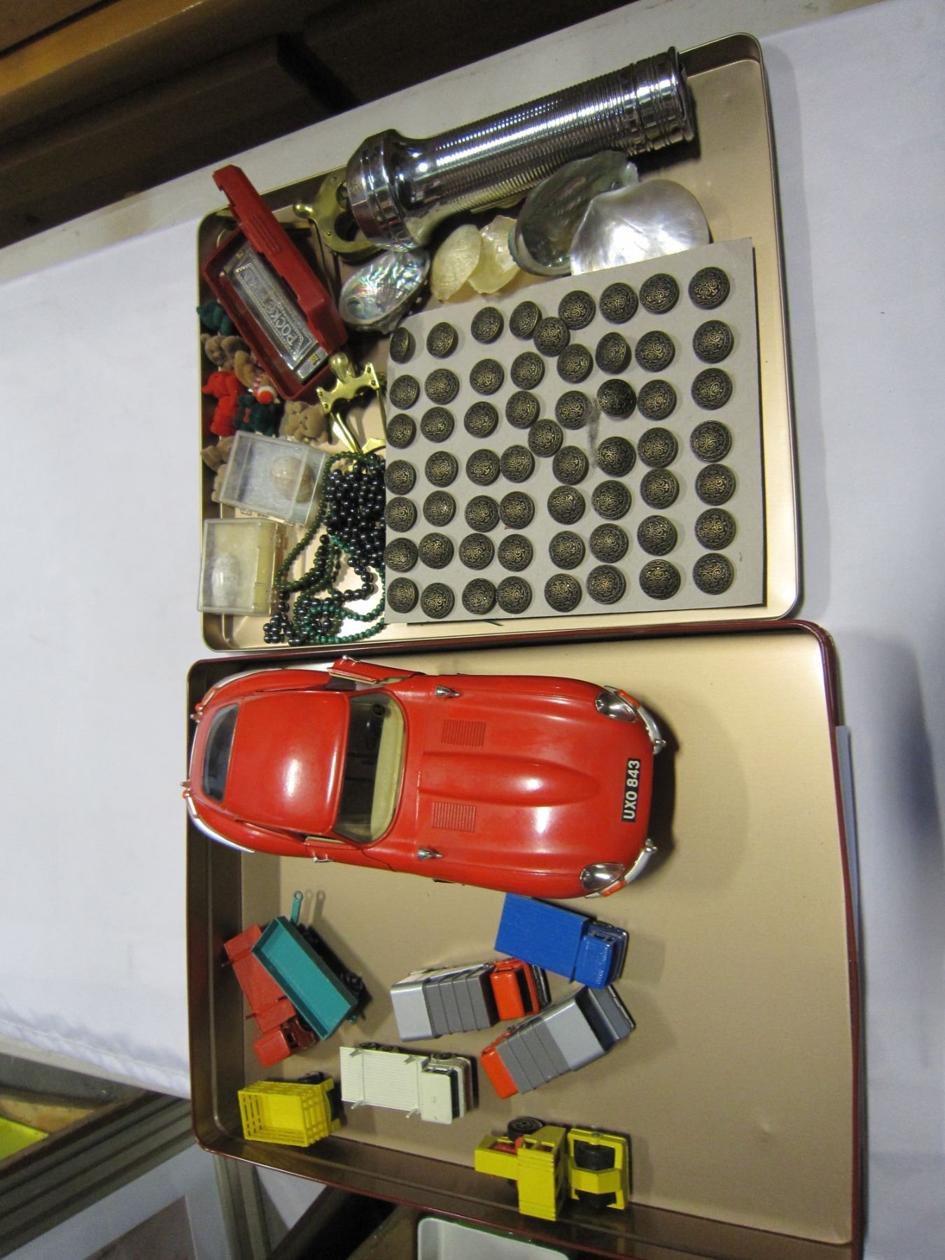 TRAY OF TOY CARS, BUTTONS, HARMONICA, COLLECTIBLES