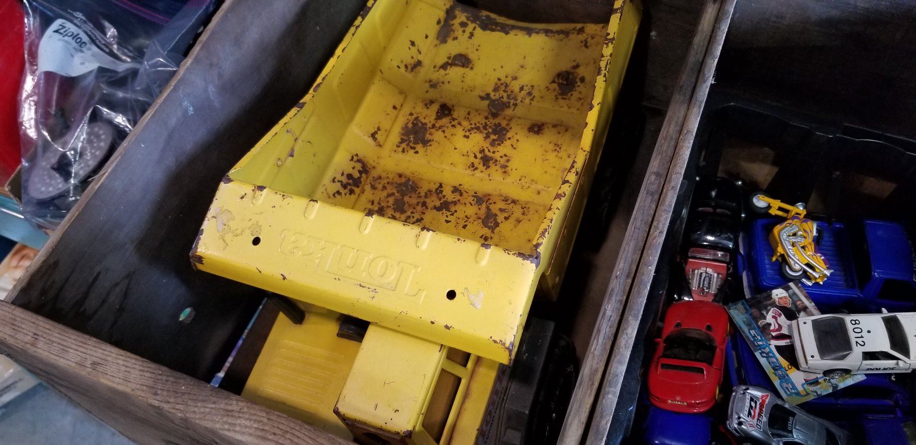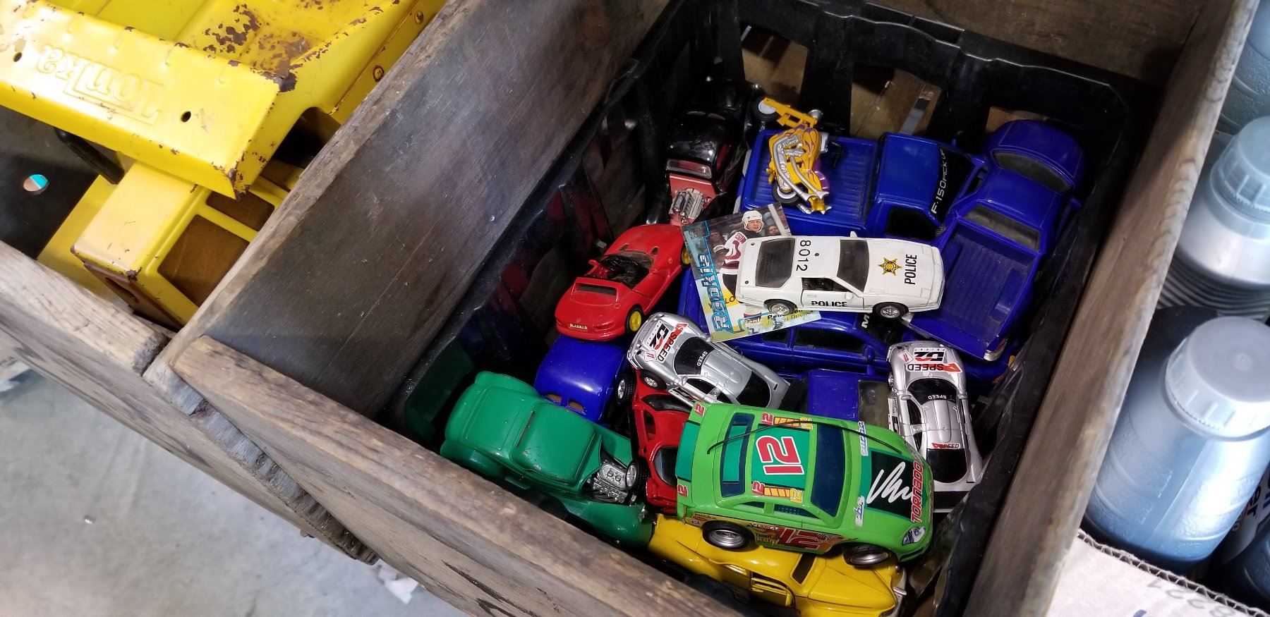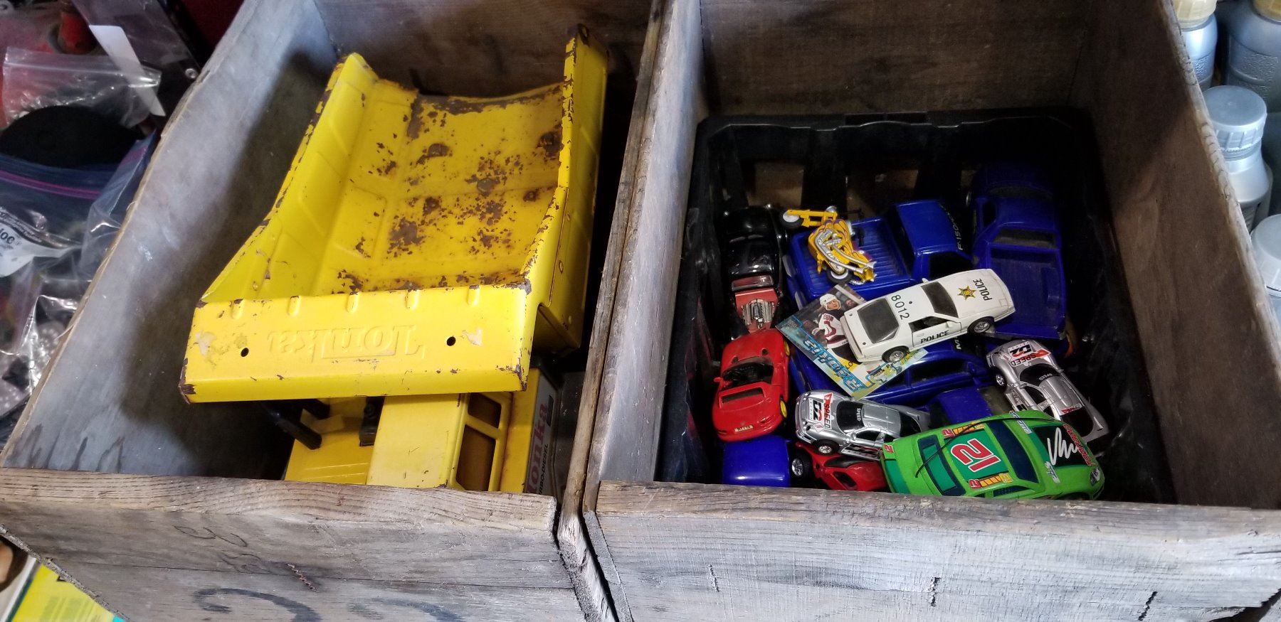 TRAY OF TOY CARS TONKA TRUCK AND WOOD CRATES