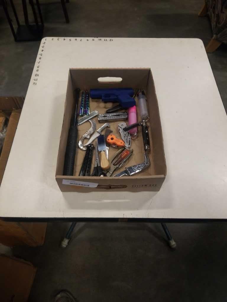 TRAY OF TRAINING GUN, EXTENDABLE BATON, MULTITOOLS AND MORE