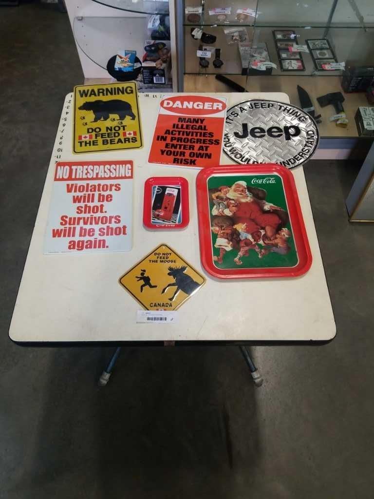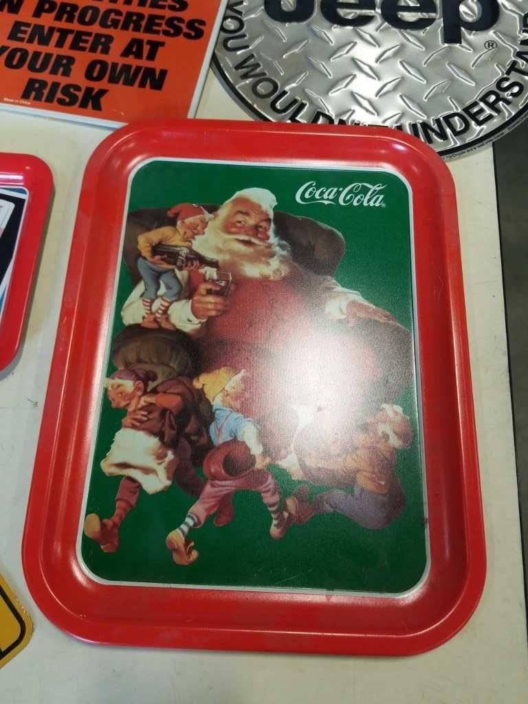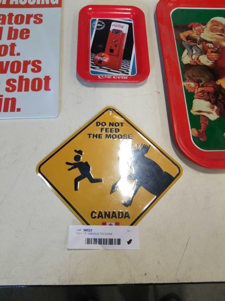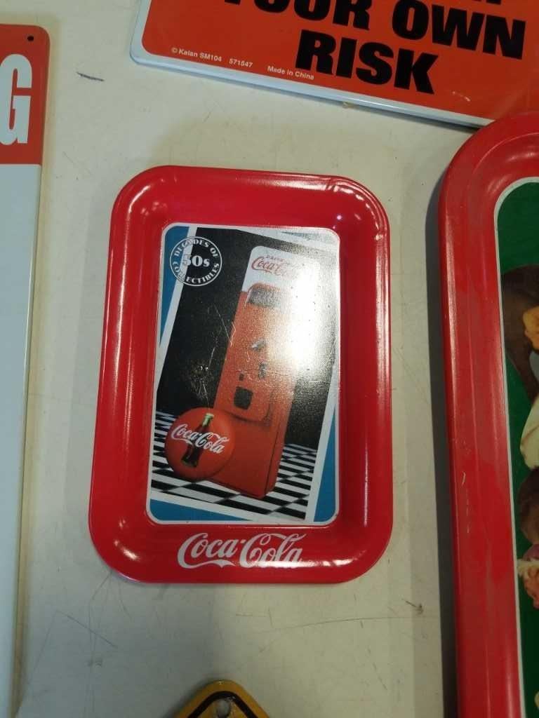 TRAY OF VARIOUS TIN SIGNS AND COCA COLA TRAYS