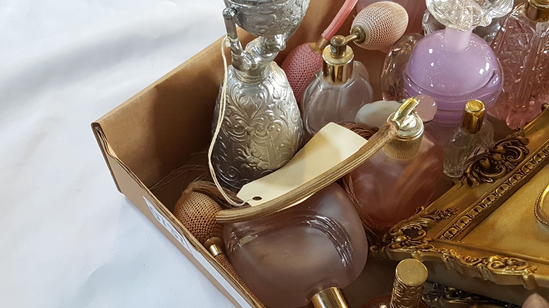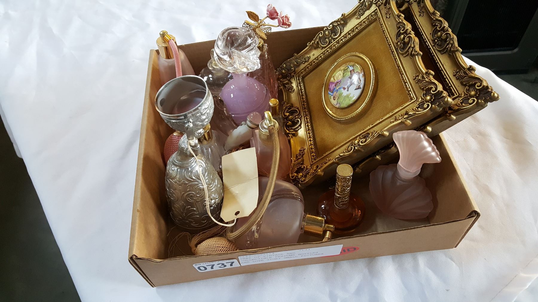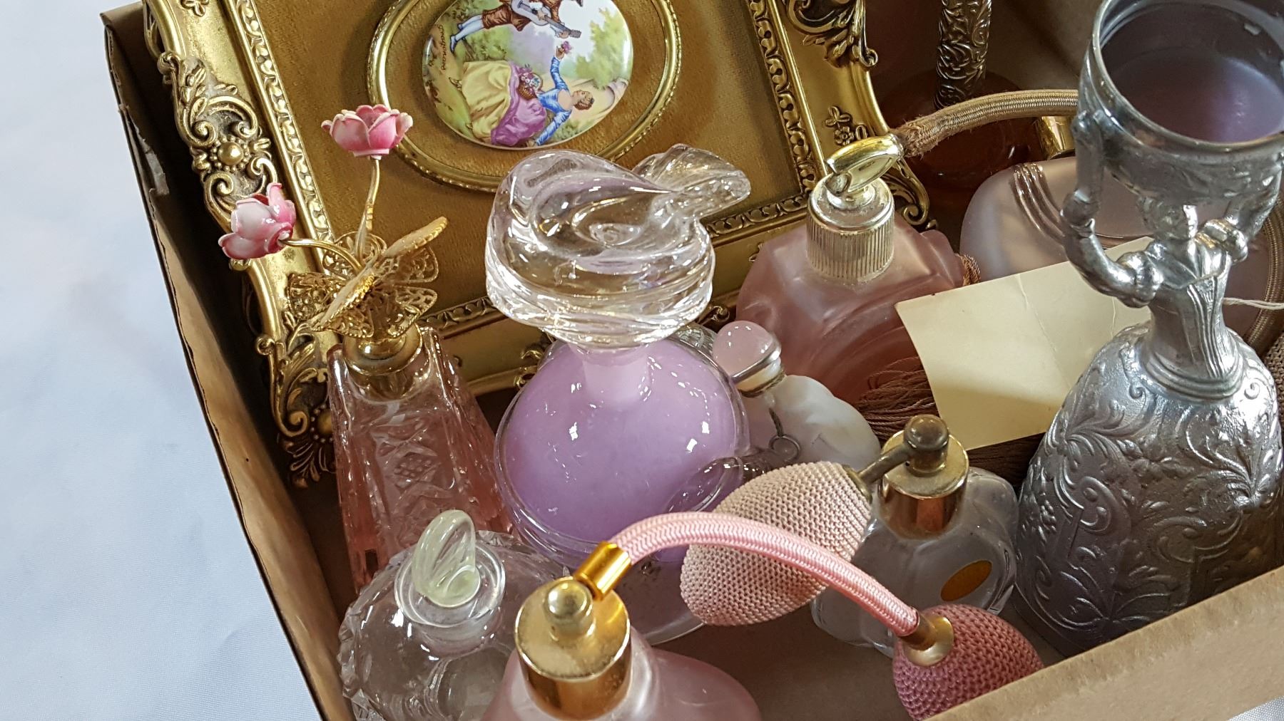 TRAY OF VINTAGE AND COLLECTIBLE PERFUME BOTTLES AND LOVE STORY SMALL PICTURES ETC