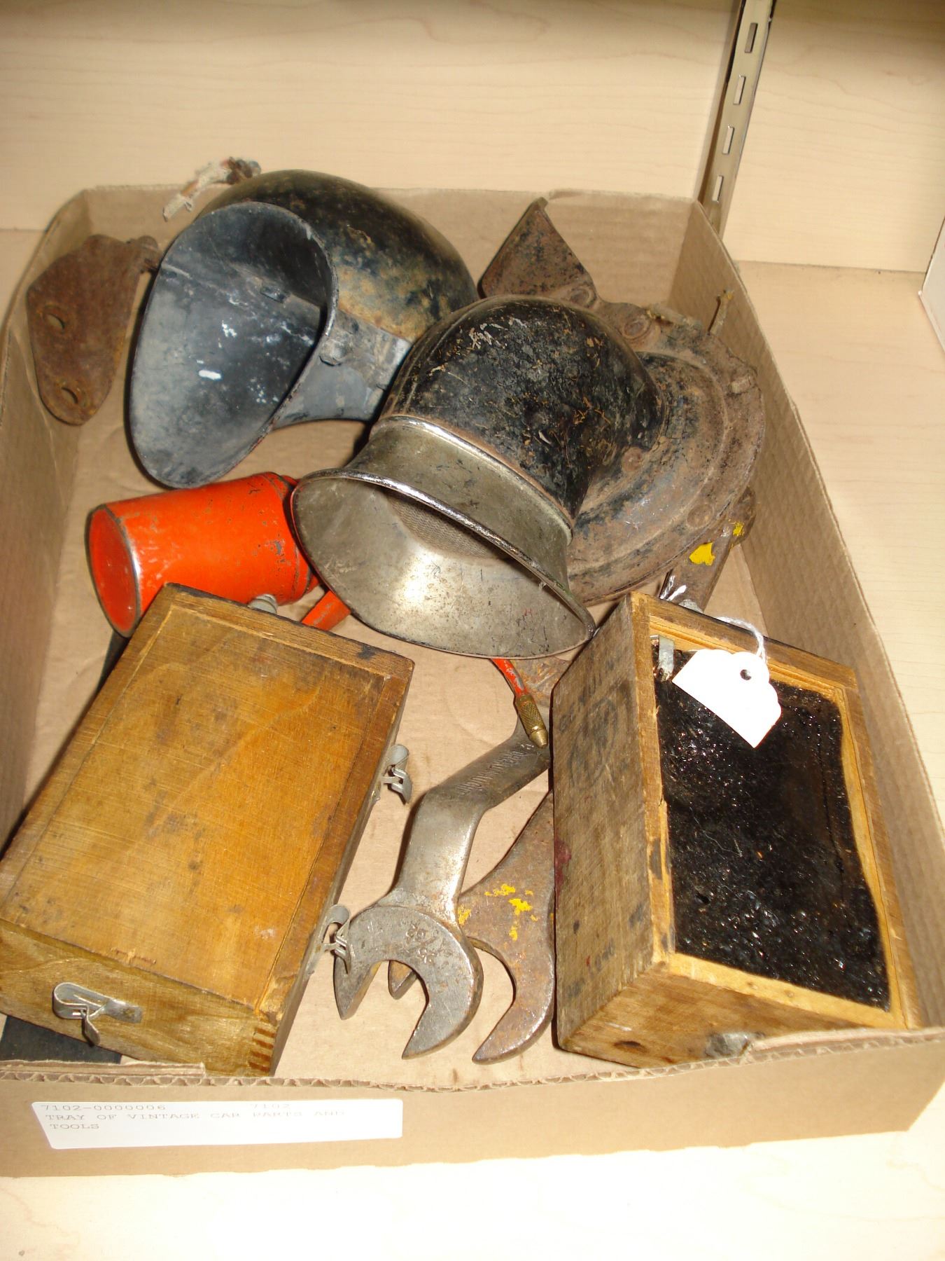 TRAY OF VINTAGE CAR PARTS AND TOOLS