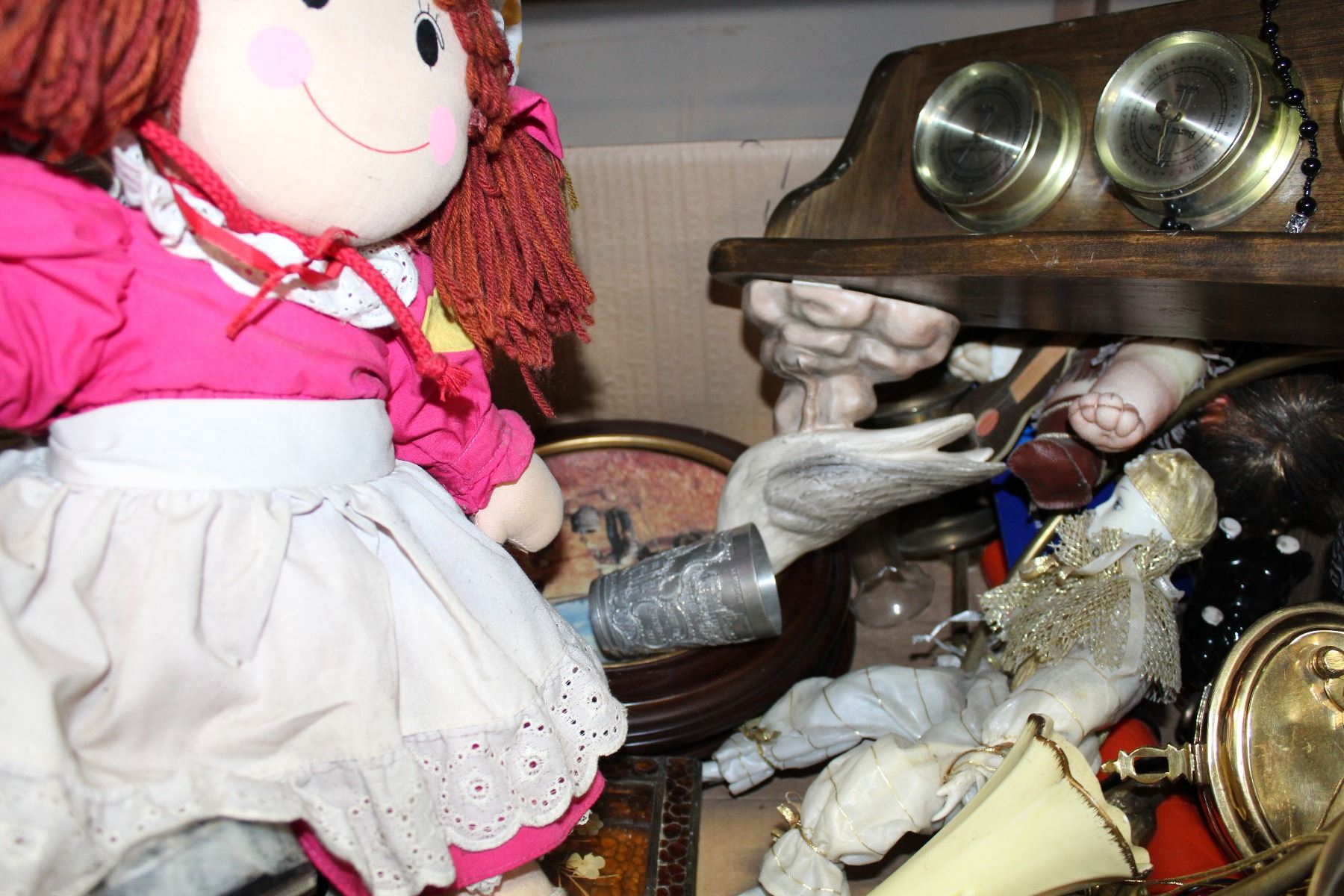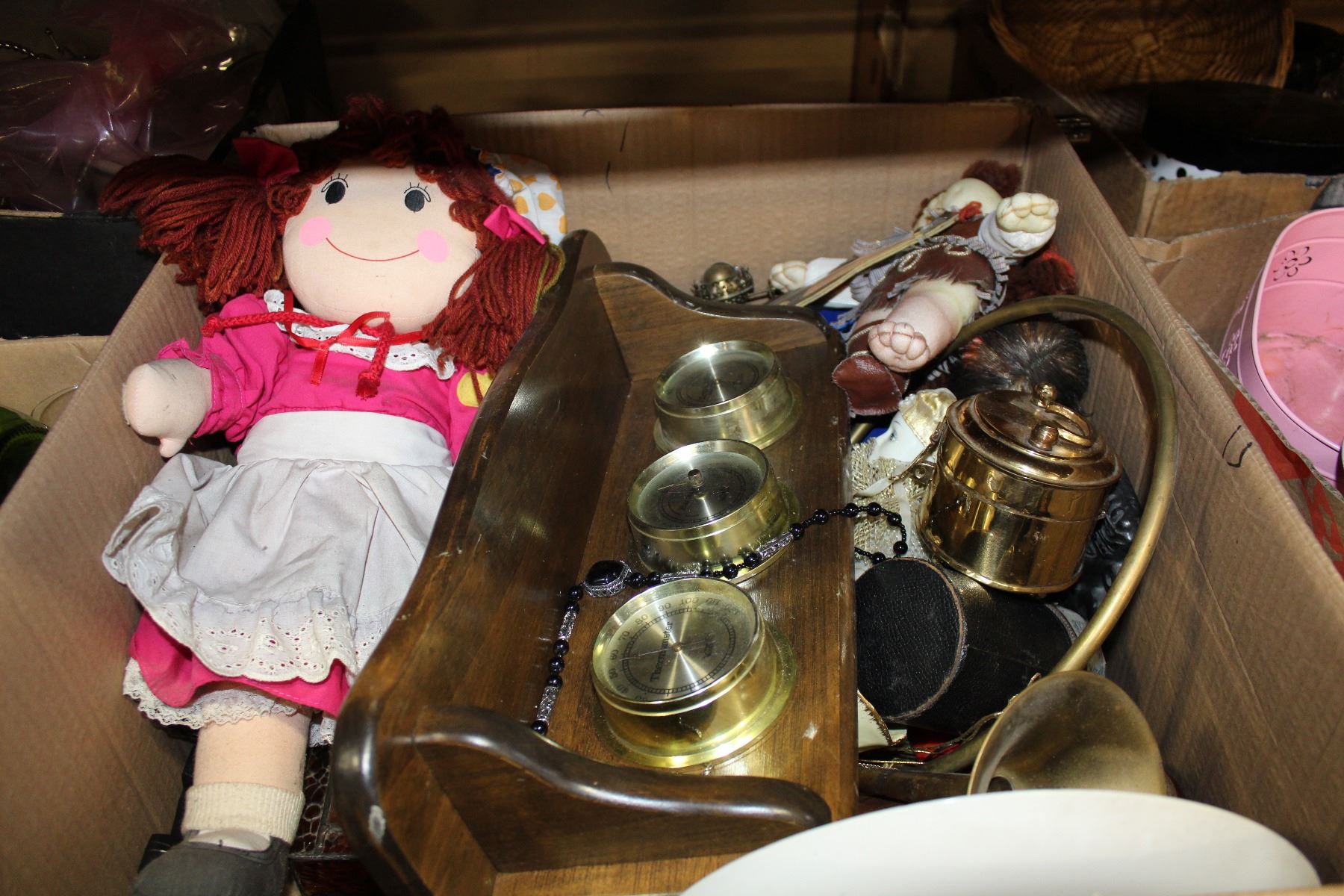TRAY OF VINTAGE COLLECTIBLES AND BAROMETER AND DOLLS