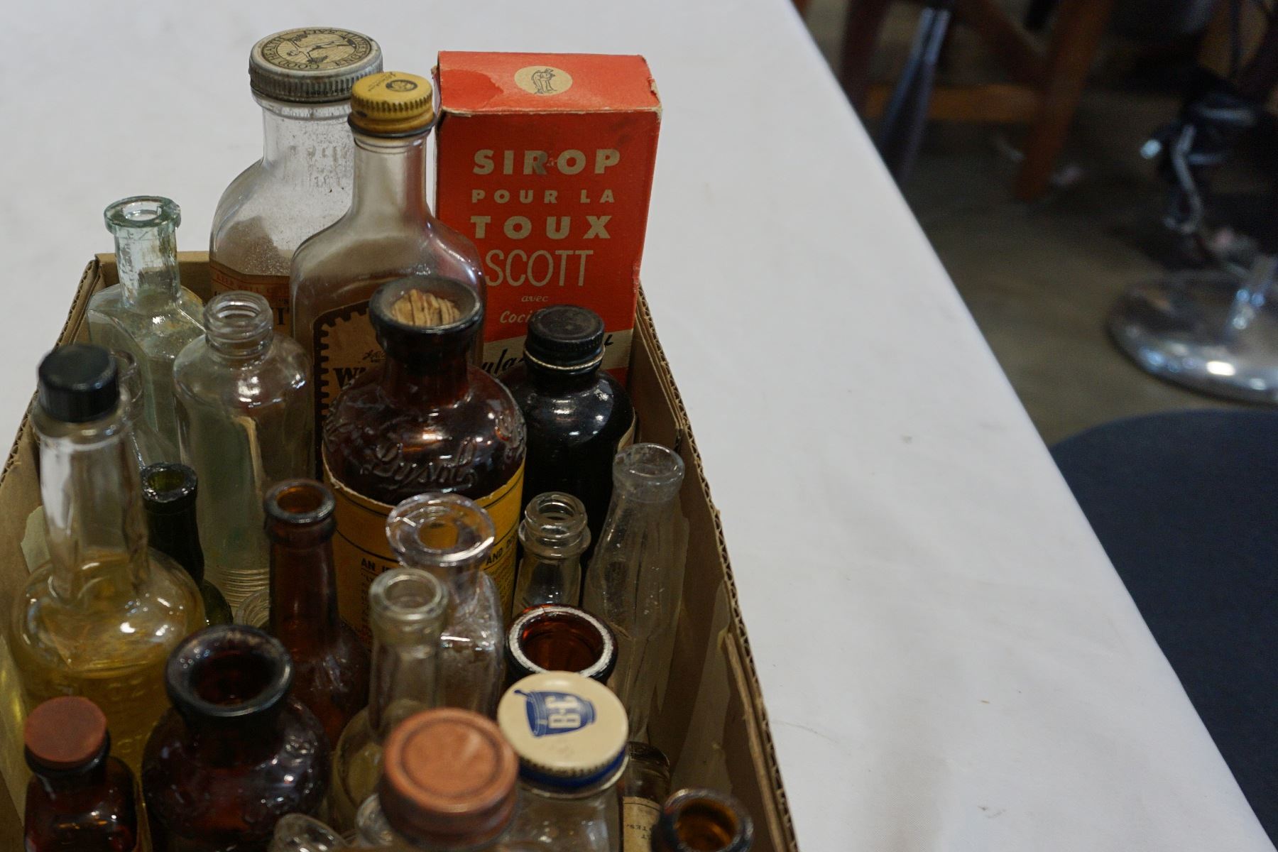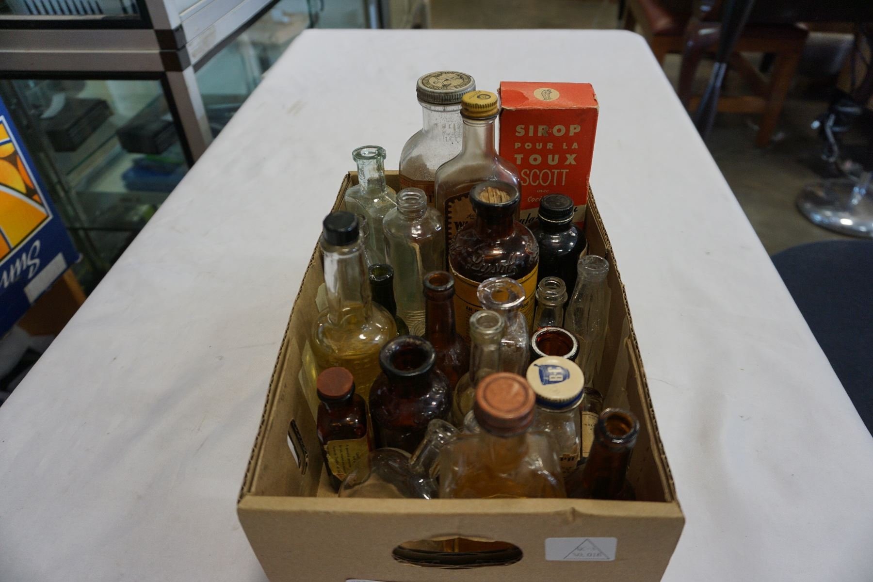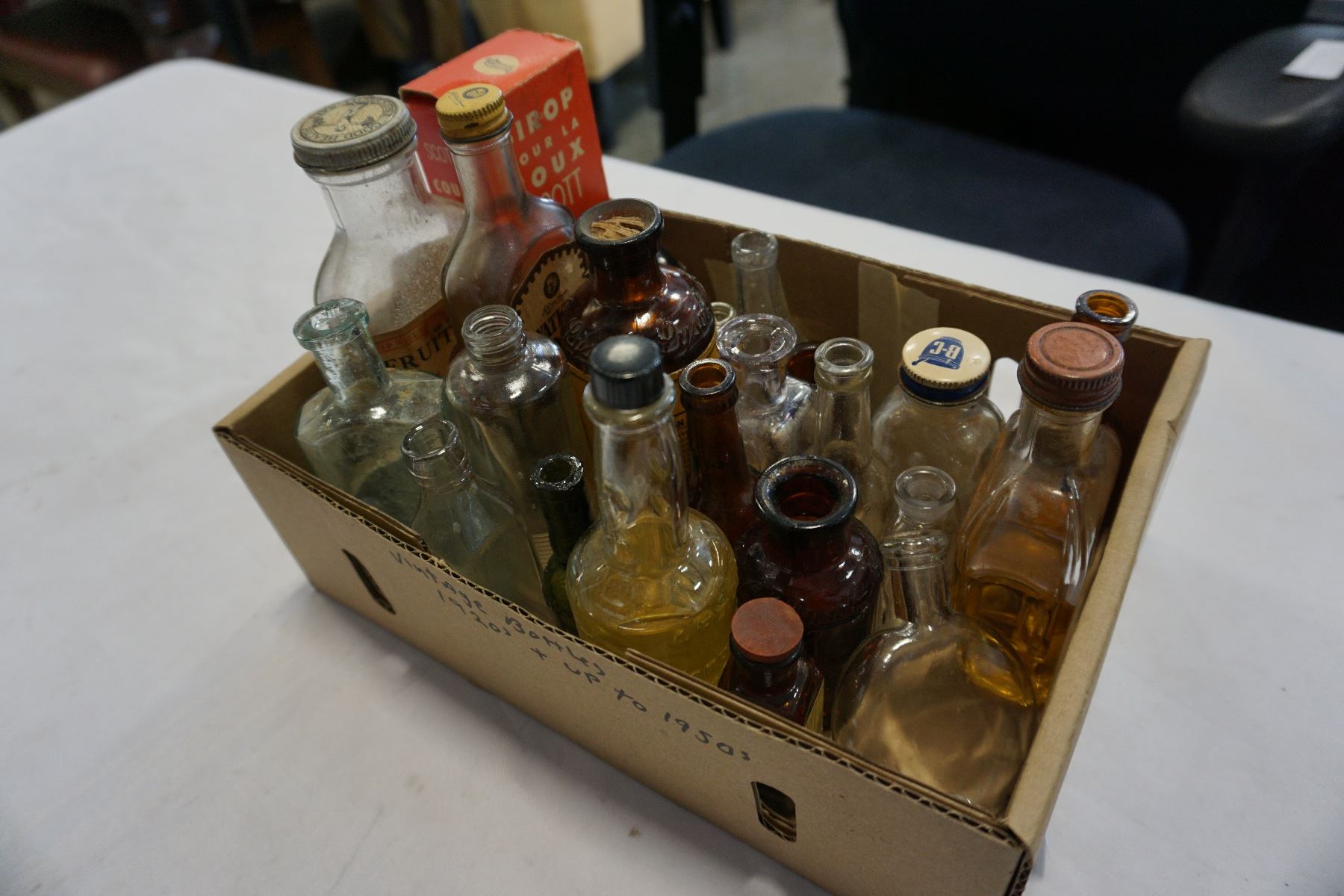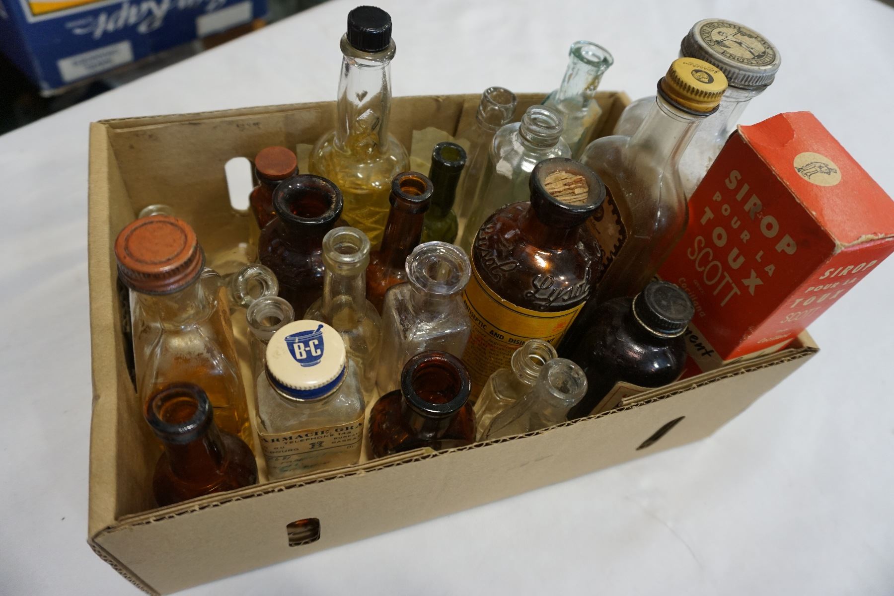 TRAY OF VINTAGE GLASS BOTTLES