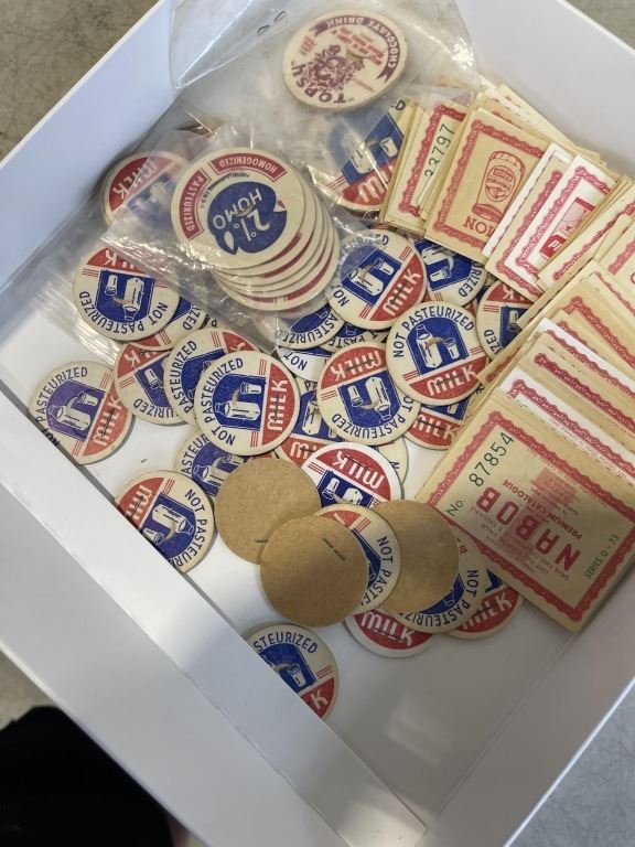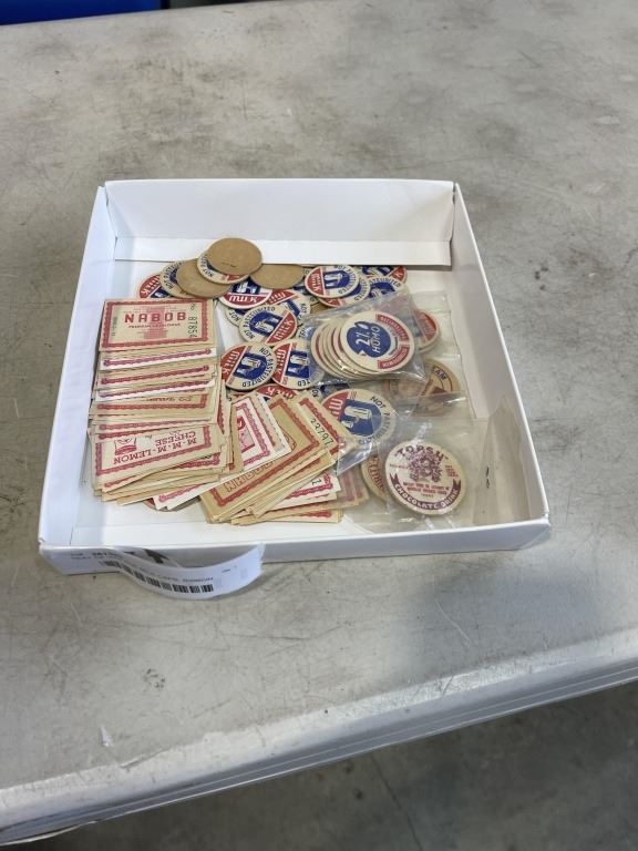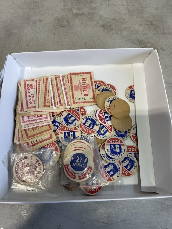 TRAY OF VINTAGE MILK CAPS, RIBBON COUPONS,