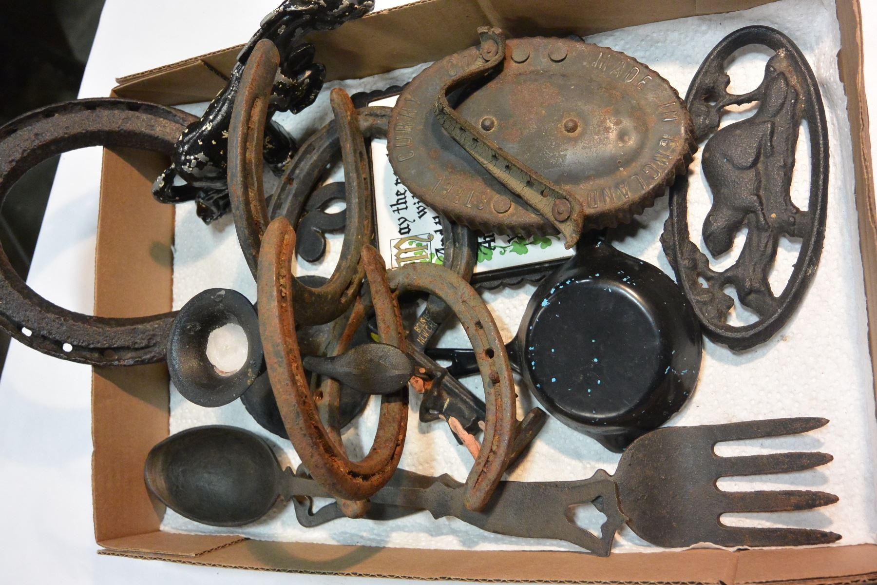 TRAY OF VINTAGE MINIATURE CAST IRON AND HORSESHOES ETC