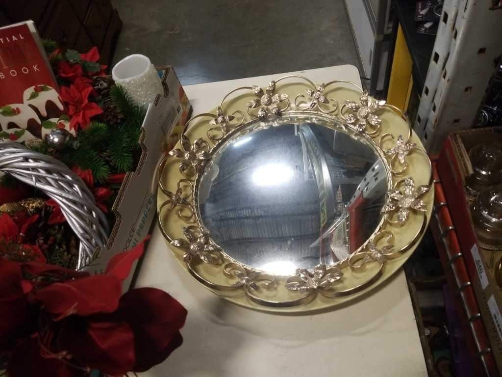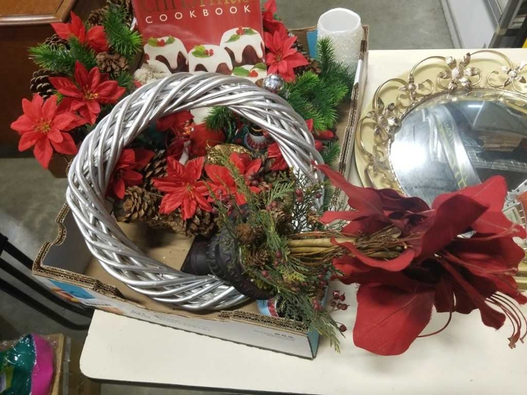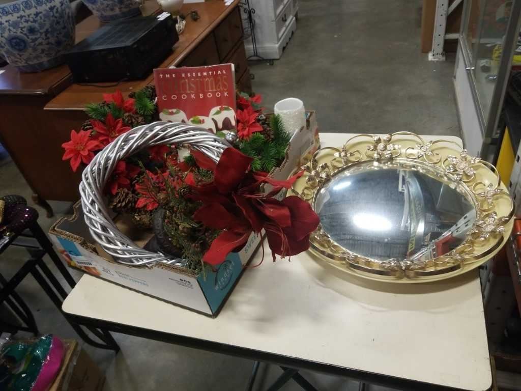TRAY OF XMAS DECOR AND MIRROR