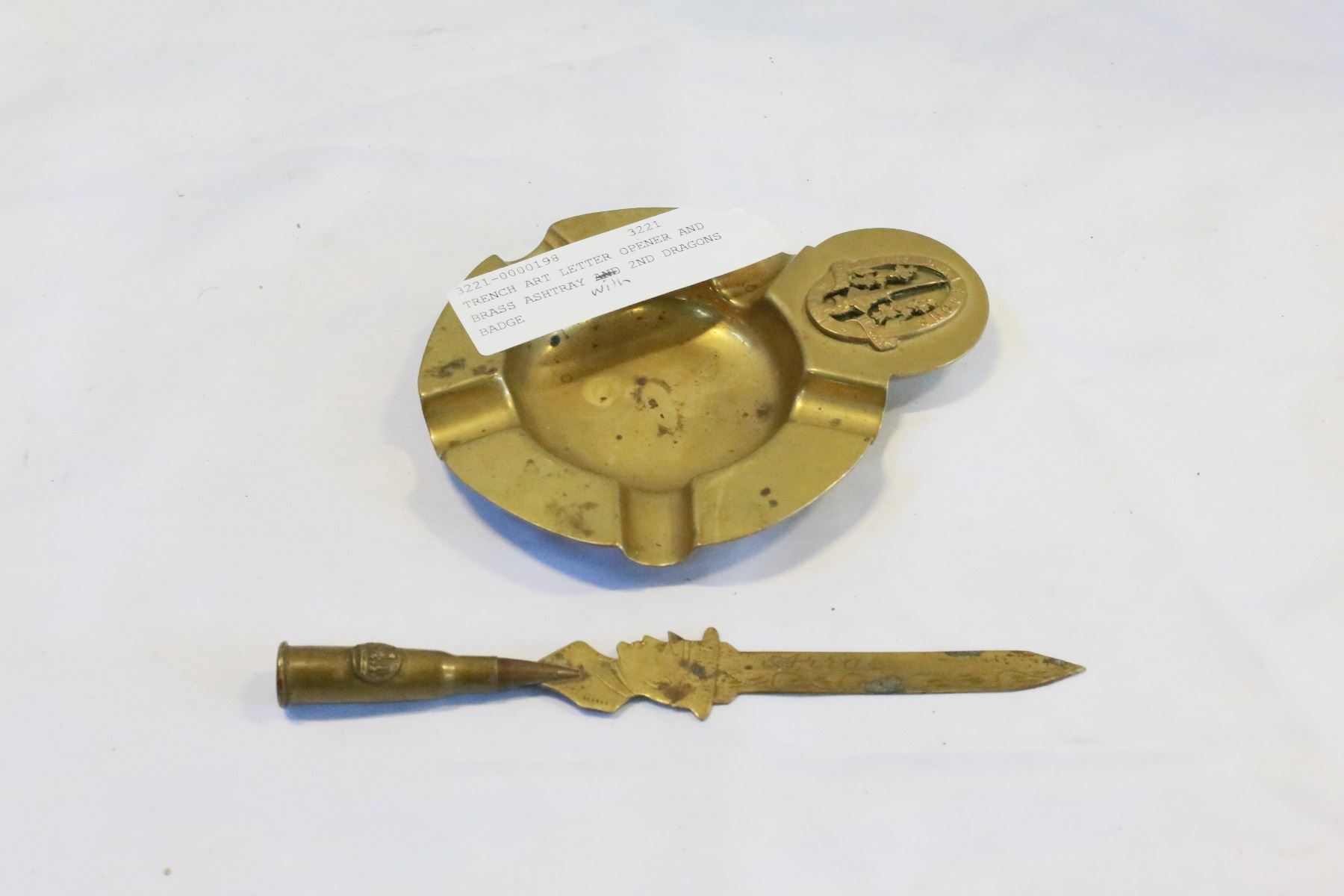 TRENCH ART LETTER OPENER AND BRASS ASHTRAY WITH SECOND DRAGONS BADGE