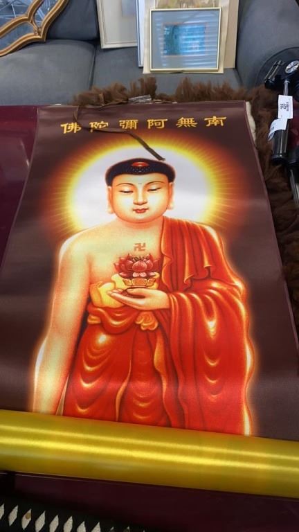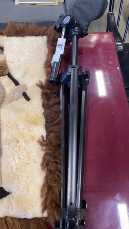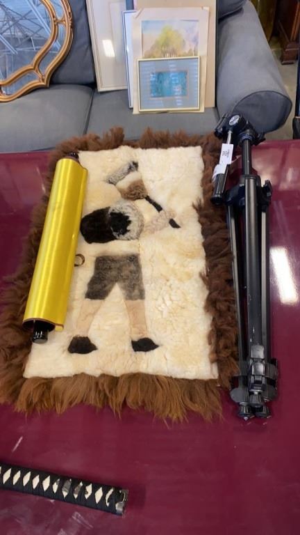 TRIPOD, HIDE THROW AND EASTERN SCROLL