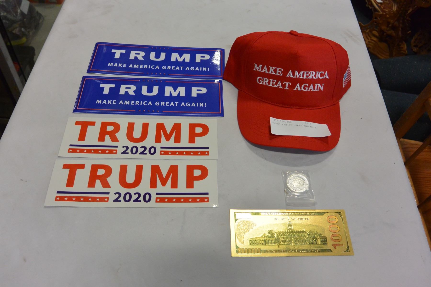 TRUMP HAT STICKERS AND COIN
