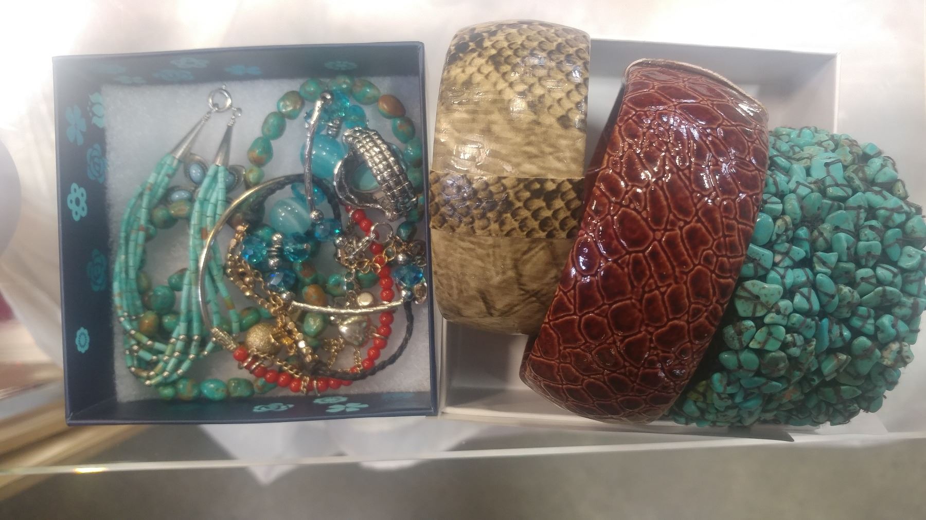 TURQUOISE AND CORAL JEWELLRY AND THREE BANGLES
