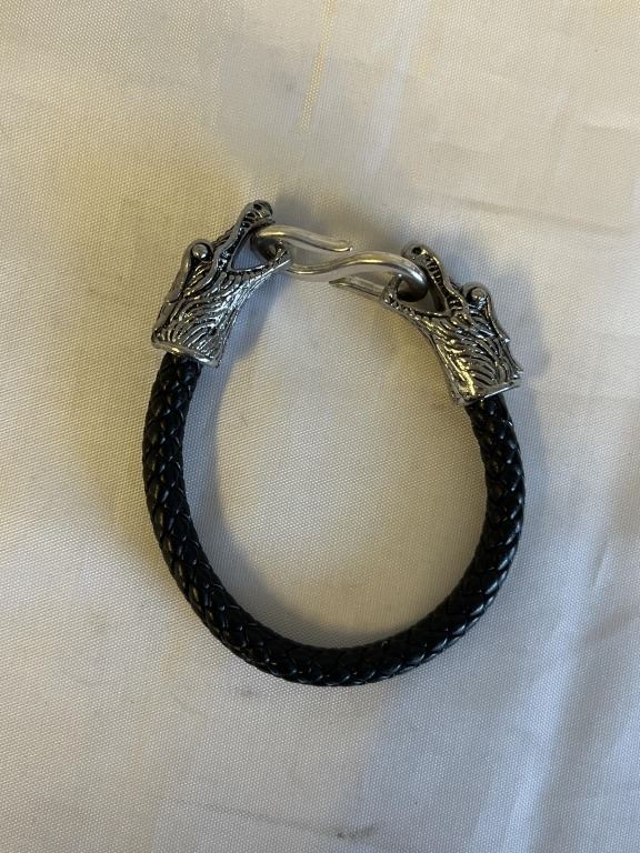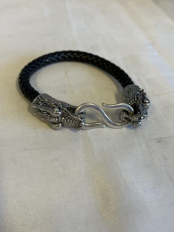 TWISTED BLACK LEATHER W/ SILVER DRAGON HEAD END BRACELET