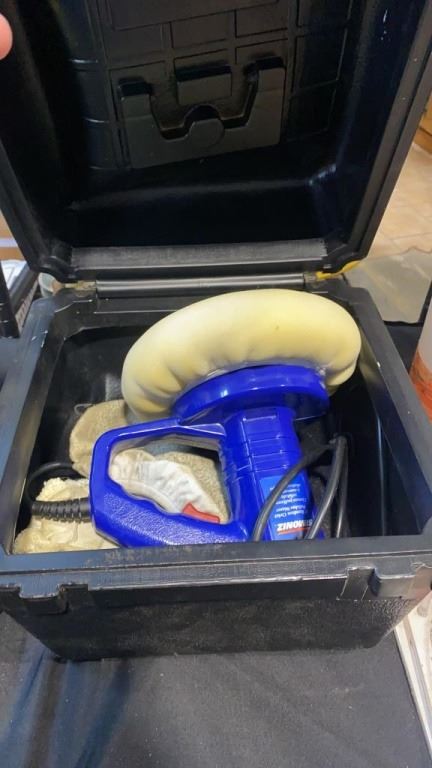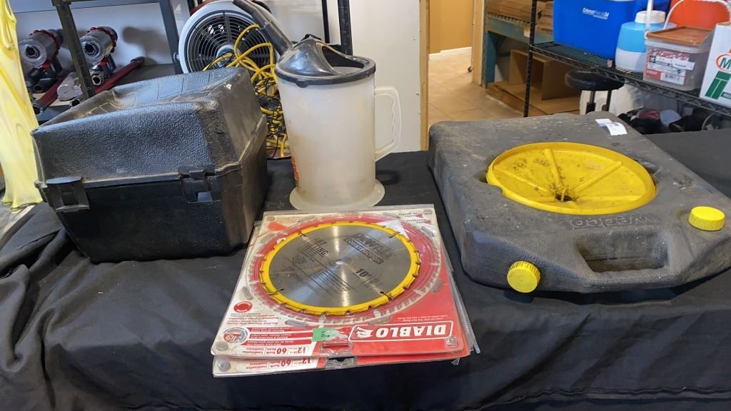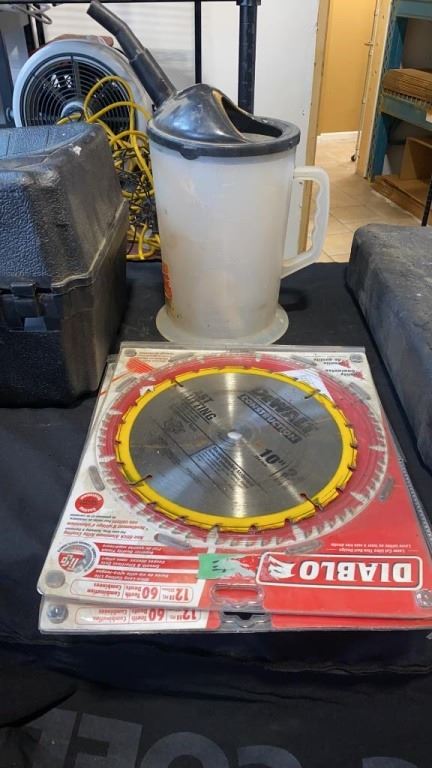 TWO 12 INCH SAW BLADES, SIMONIZ POLISHER, OIL PAN AND FUNNEL