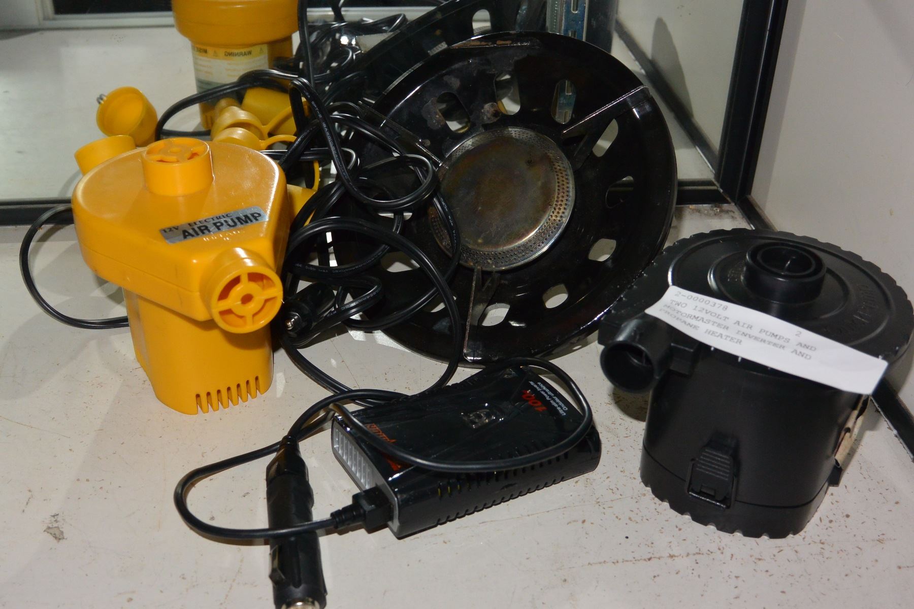 TWO 12VOLT AIR PUMPS AND MOTORMASTER INVERTER AND PROPANE HEATER