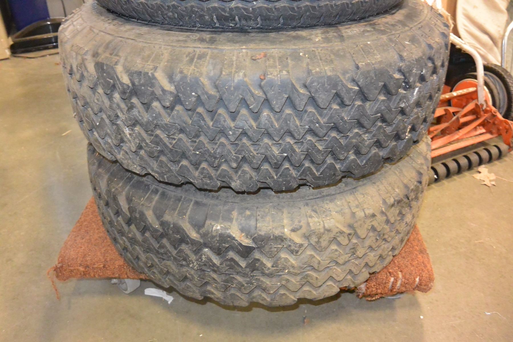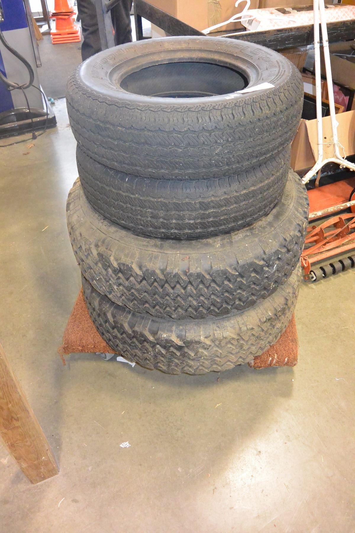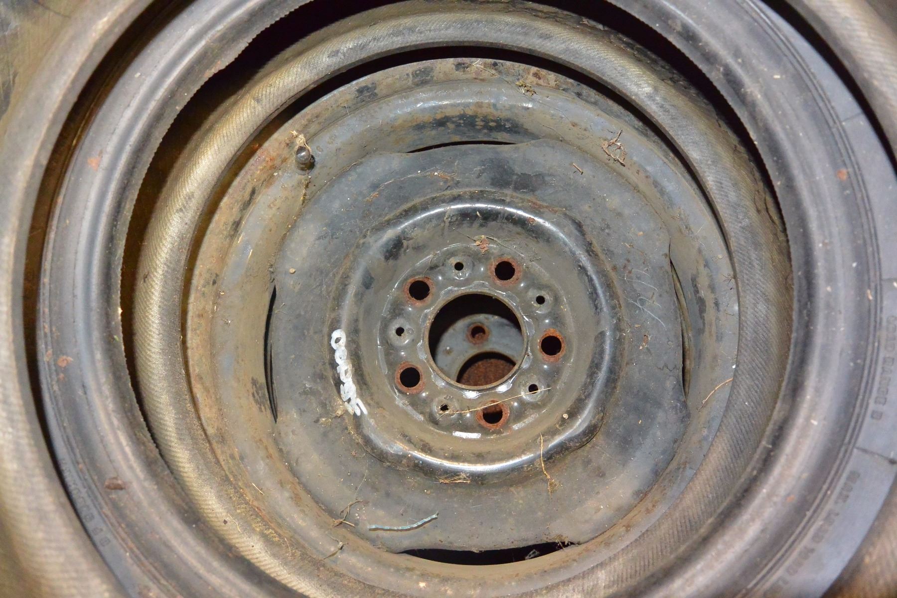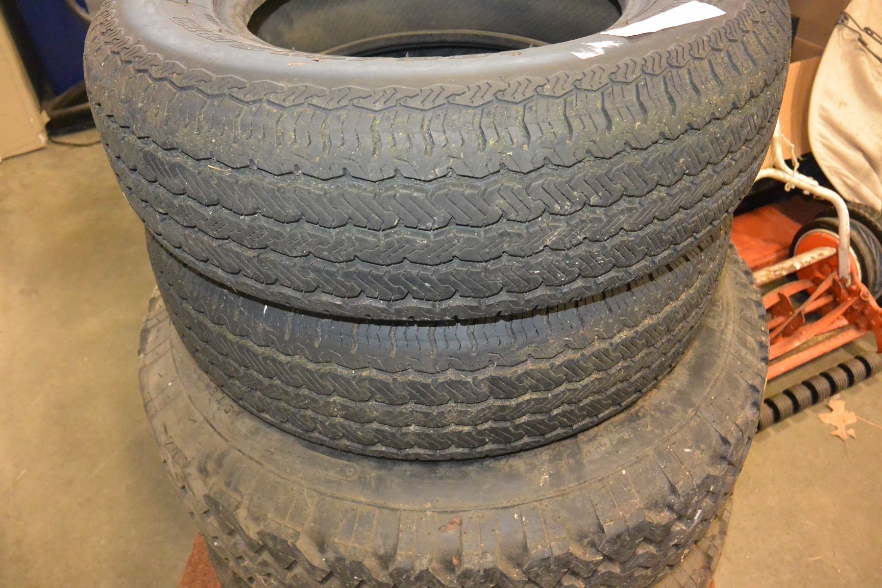 TWO 15 INCH TIRES WITH 5 BOLT RIMS AND 2 BF GOODRICH 13 INCH TIRES