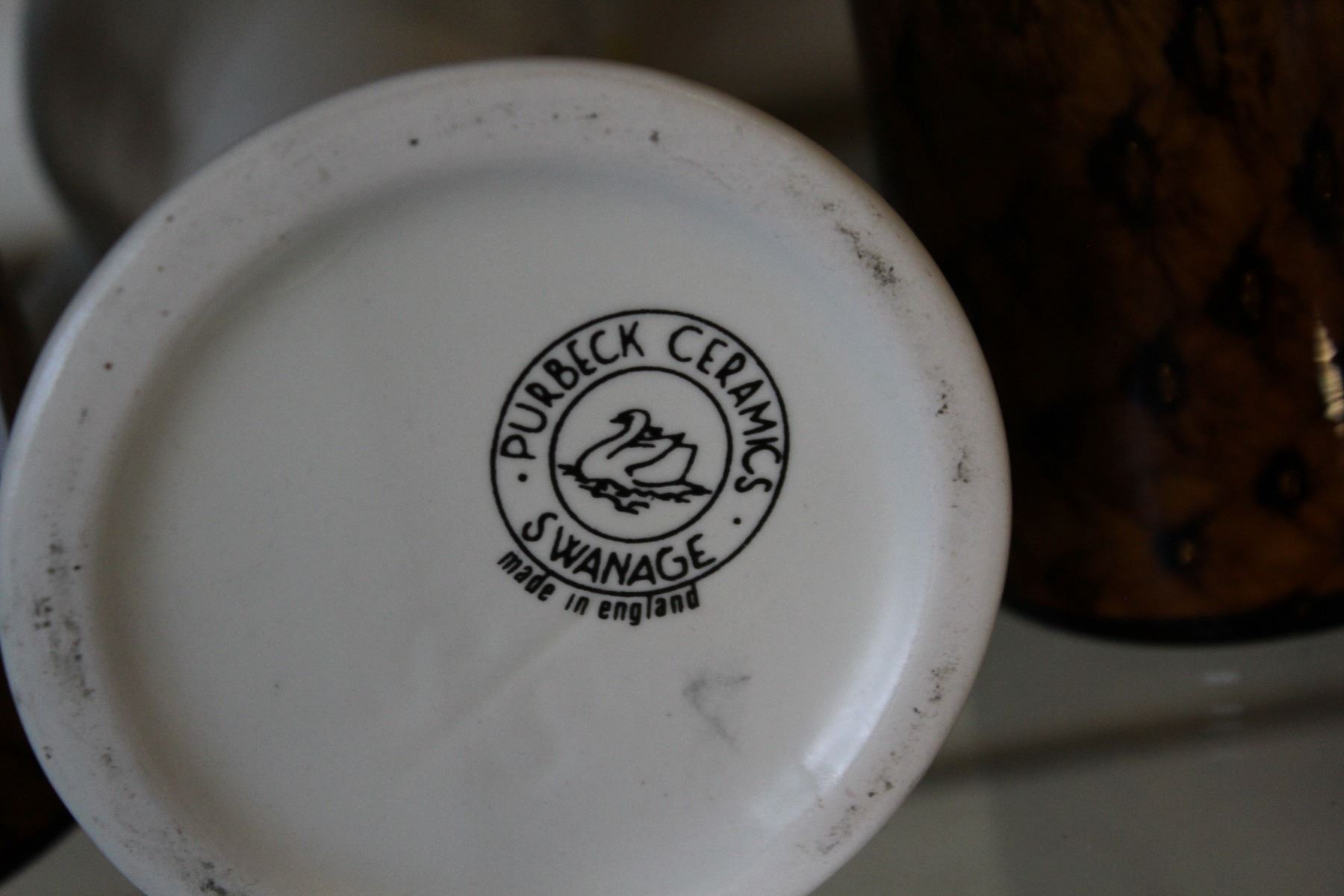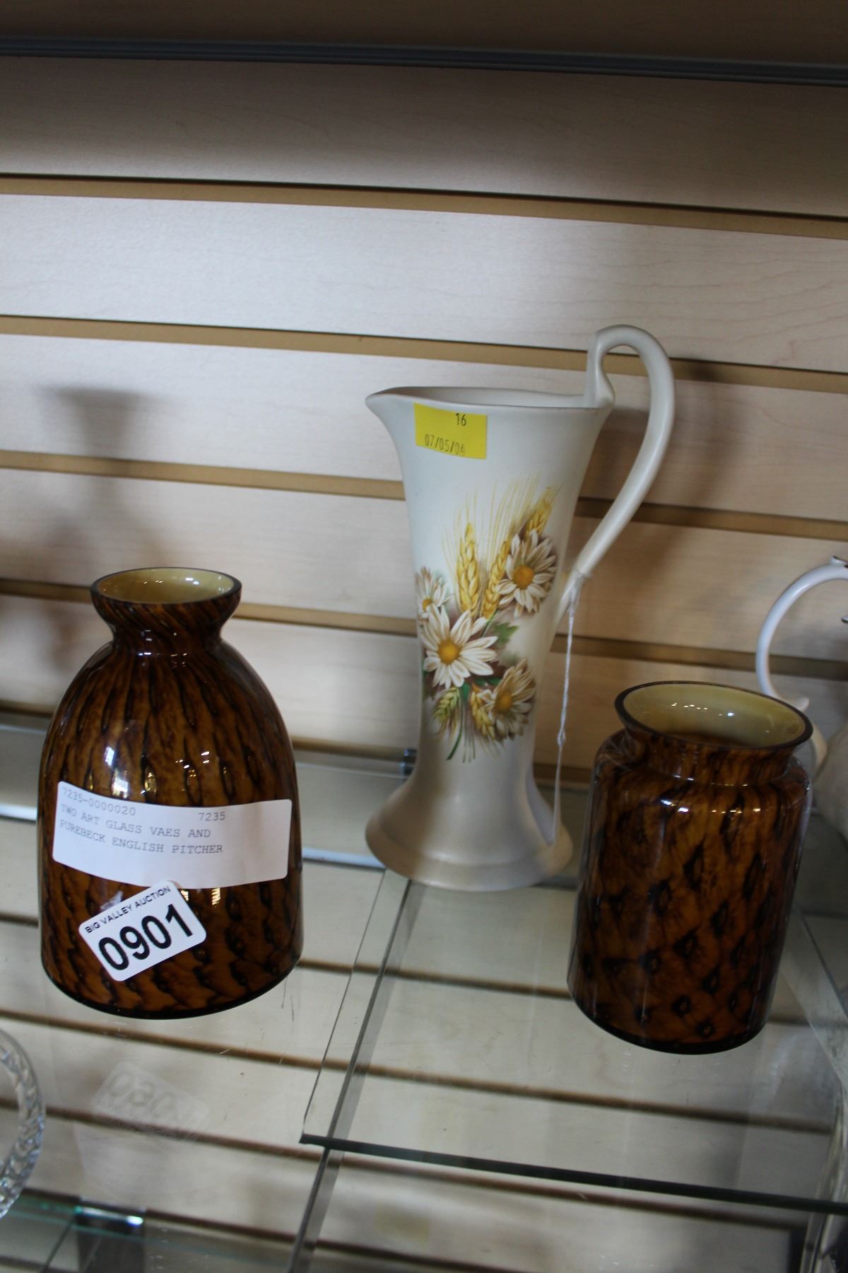 TWO ART GLASS VASES AND PUREBECK ENGLISH PITCHER