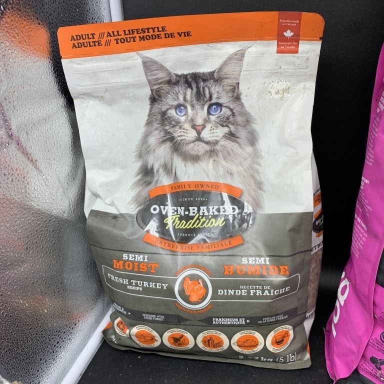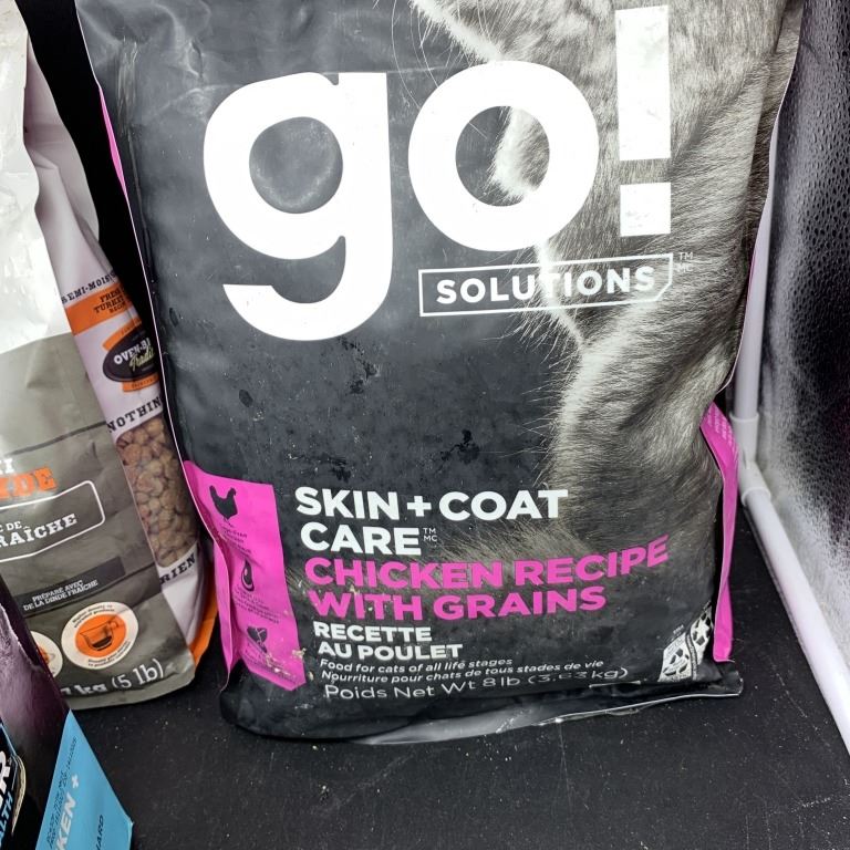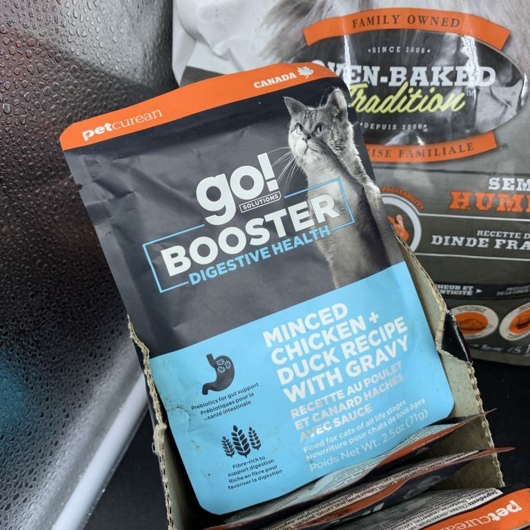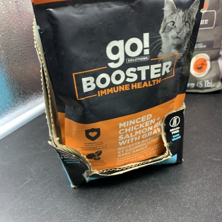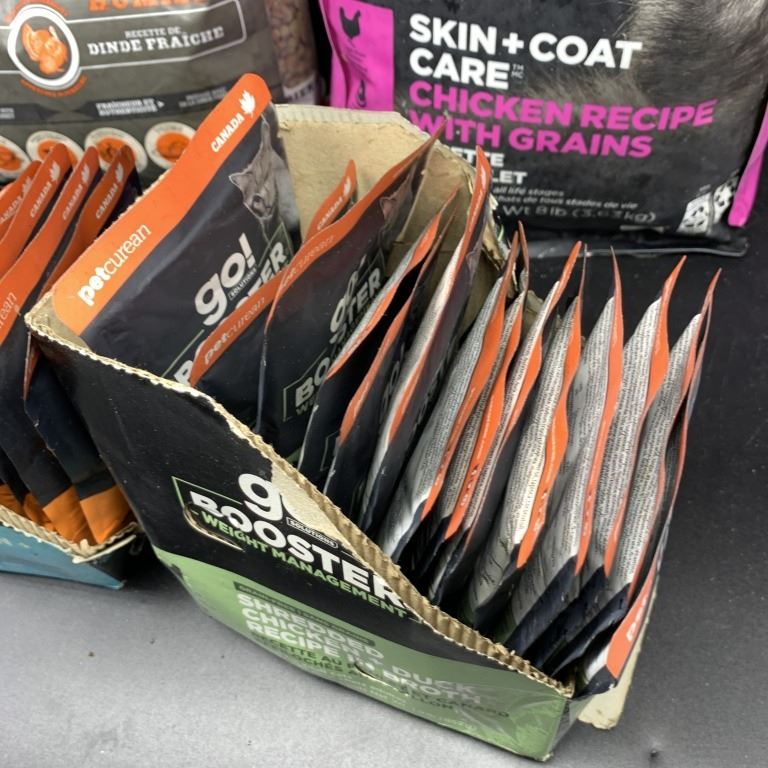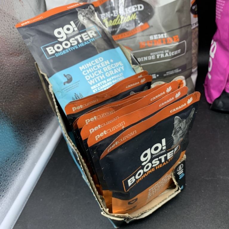TWO BAGS OF CAT FOOD AND 25 POUCHES OF CAT BOOSTER