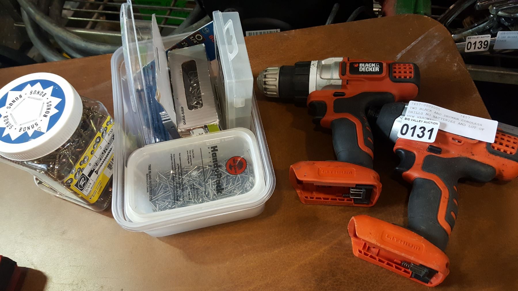 TWO BLACK AND DECKER CORDLESS DRILLS NO BATTERIES AND LOT OF NEW HARDWARE