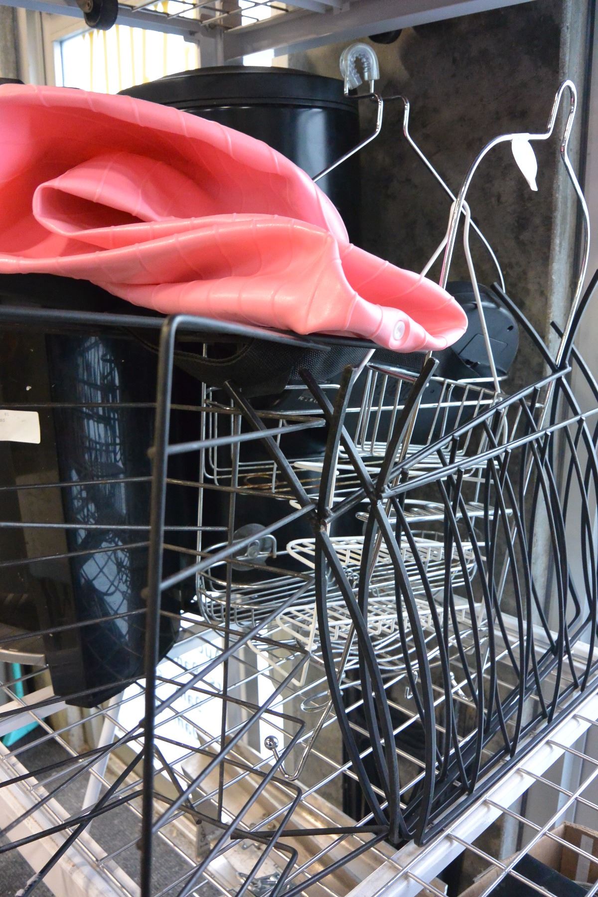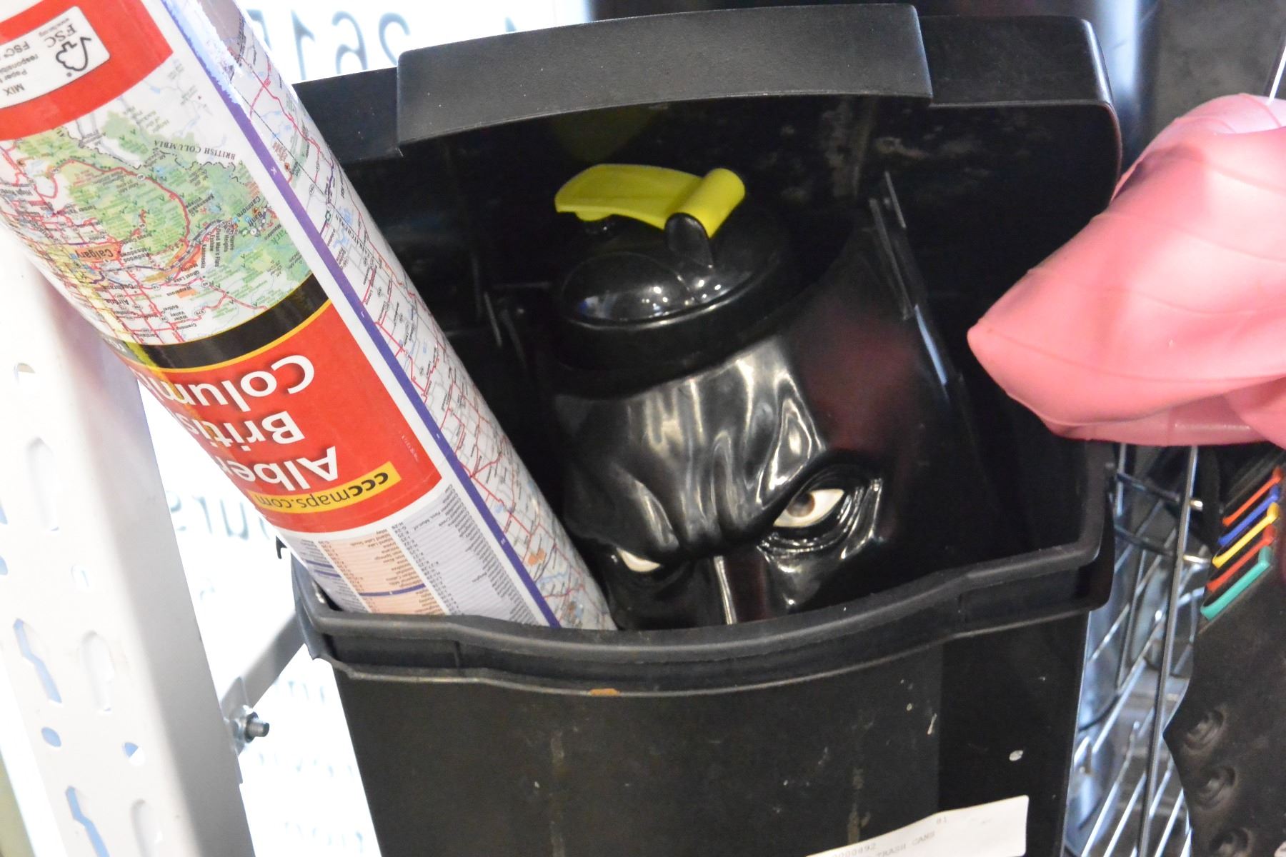 TWO BLACK TRASH CANS AND MAFAZINE RACKS AND ESTATE GOODS