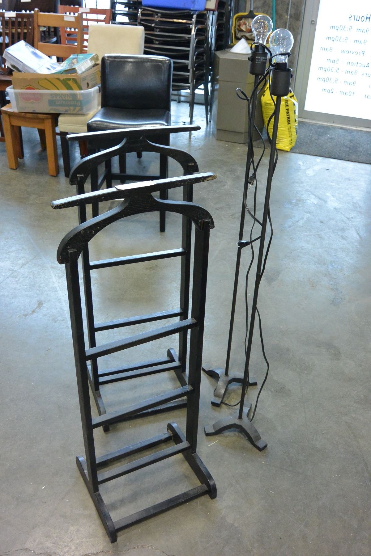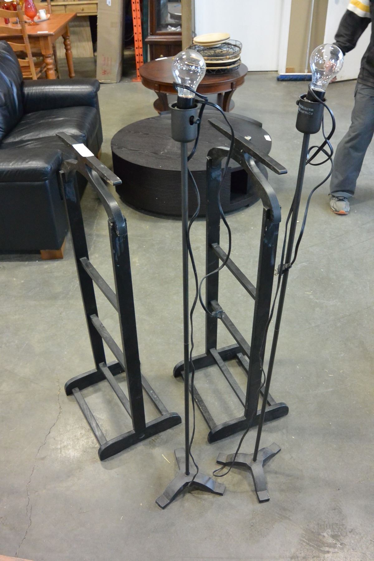 TWO BLACK VALET STANDS AND TWO METAL LAMP BASES