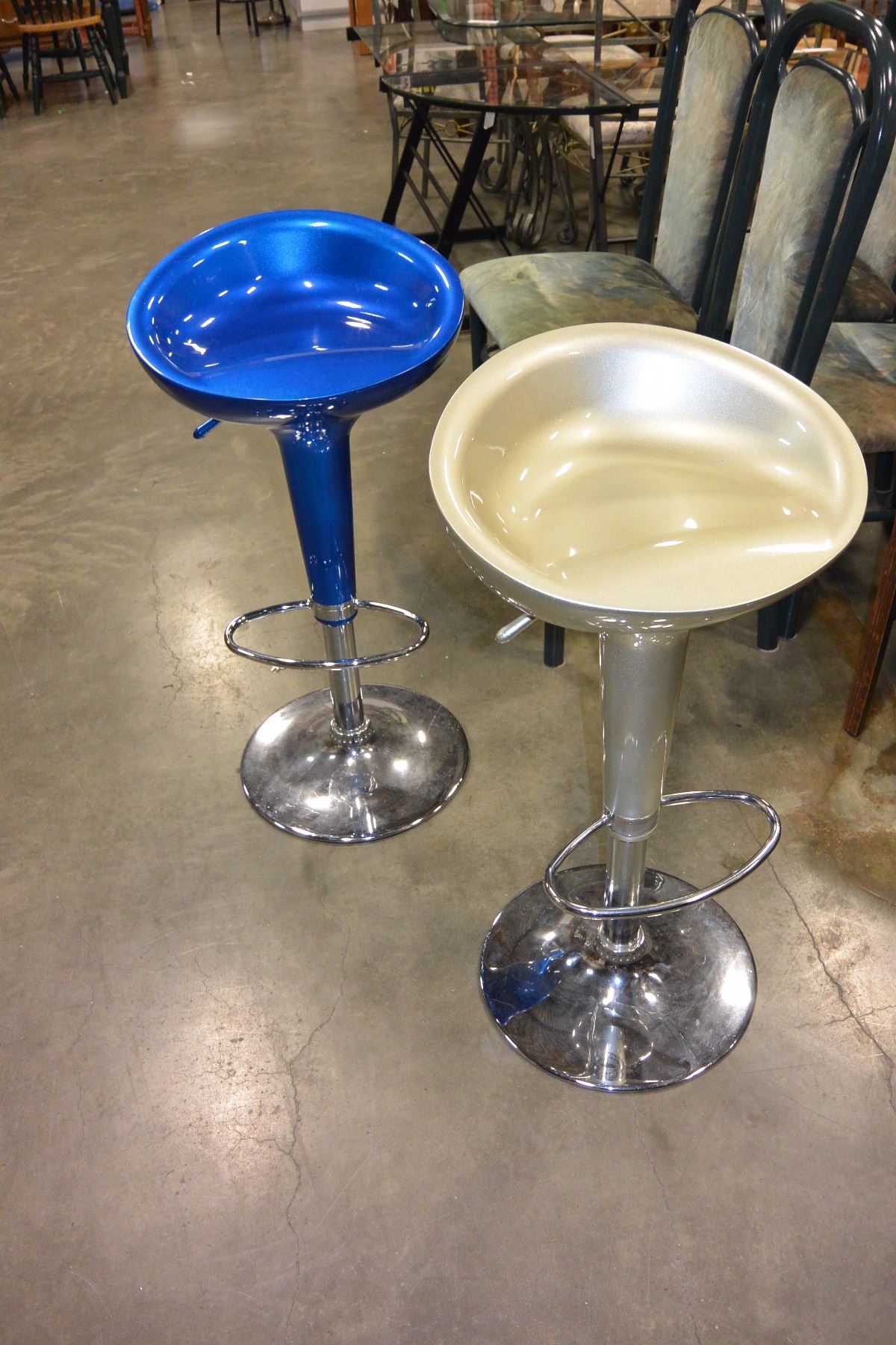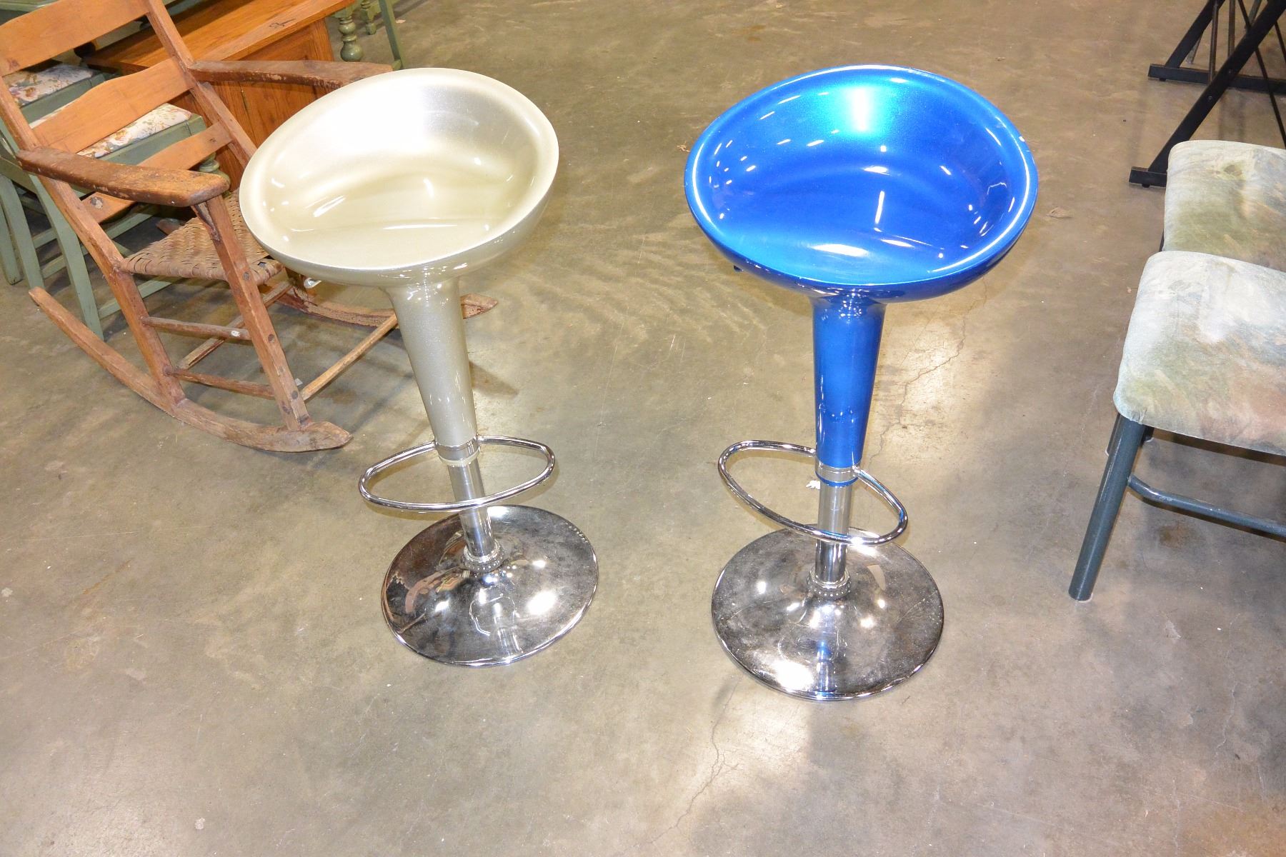 TWO BLUE AND LIGHT GOLD AND CHROME GAS LIFT BARSTOOLS