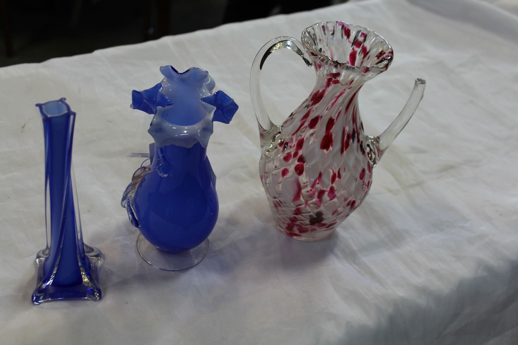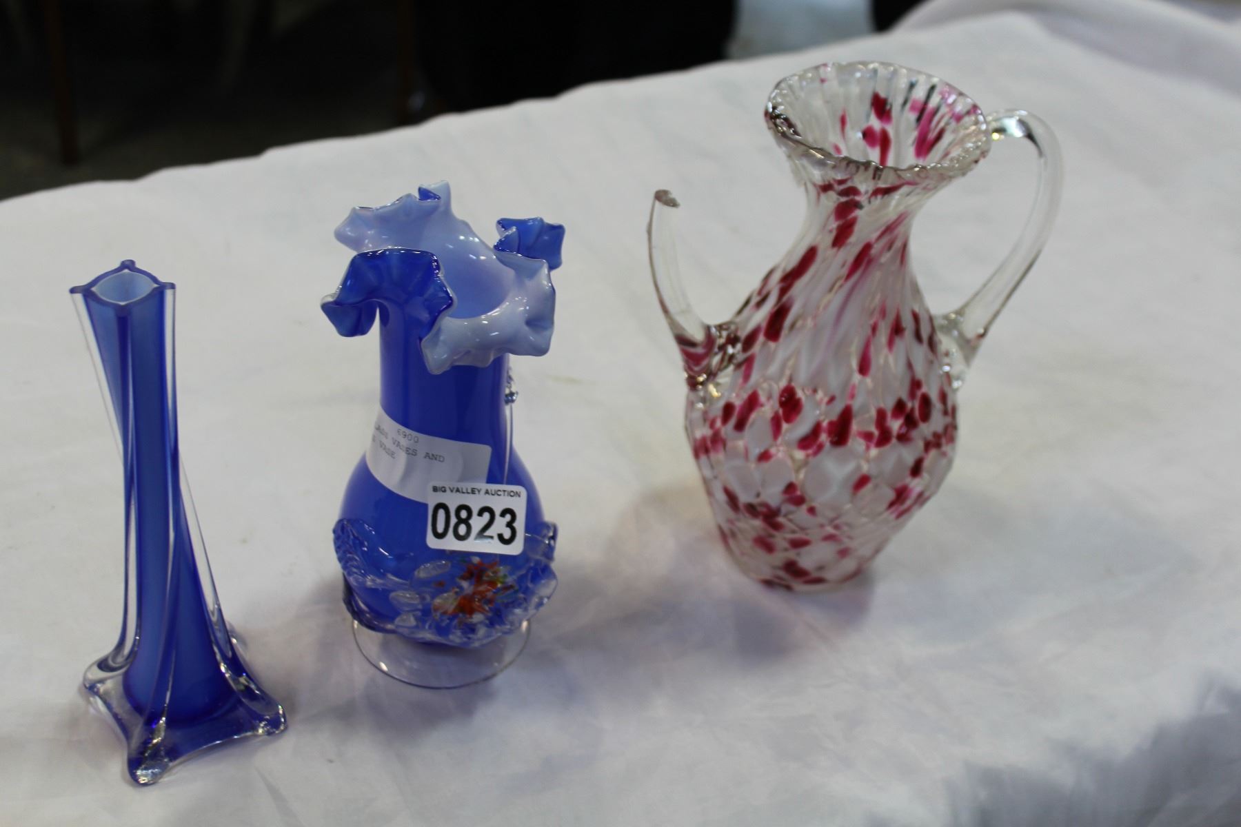 TWO BLUE ART GLASS VASES AND AS IS ART GLASS VASE