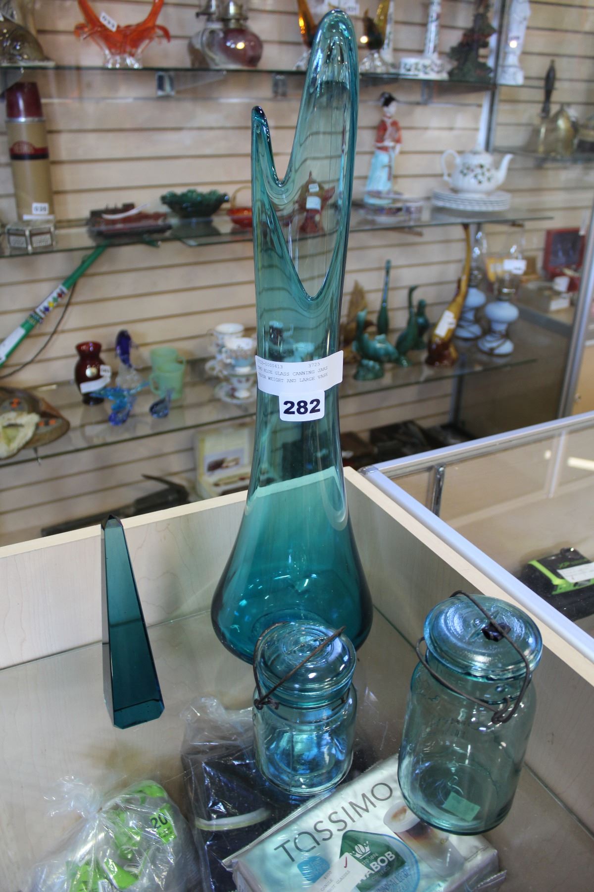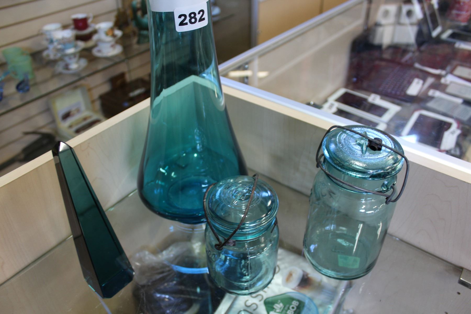 TWO BLUE GLASS CANNING JARS PAPER WEIGHT AND LARGE VASE