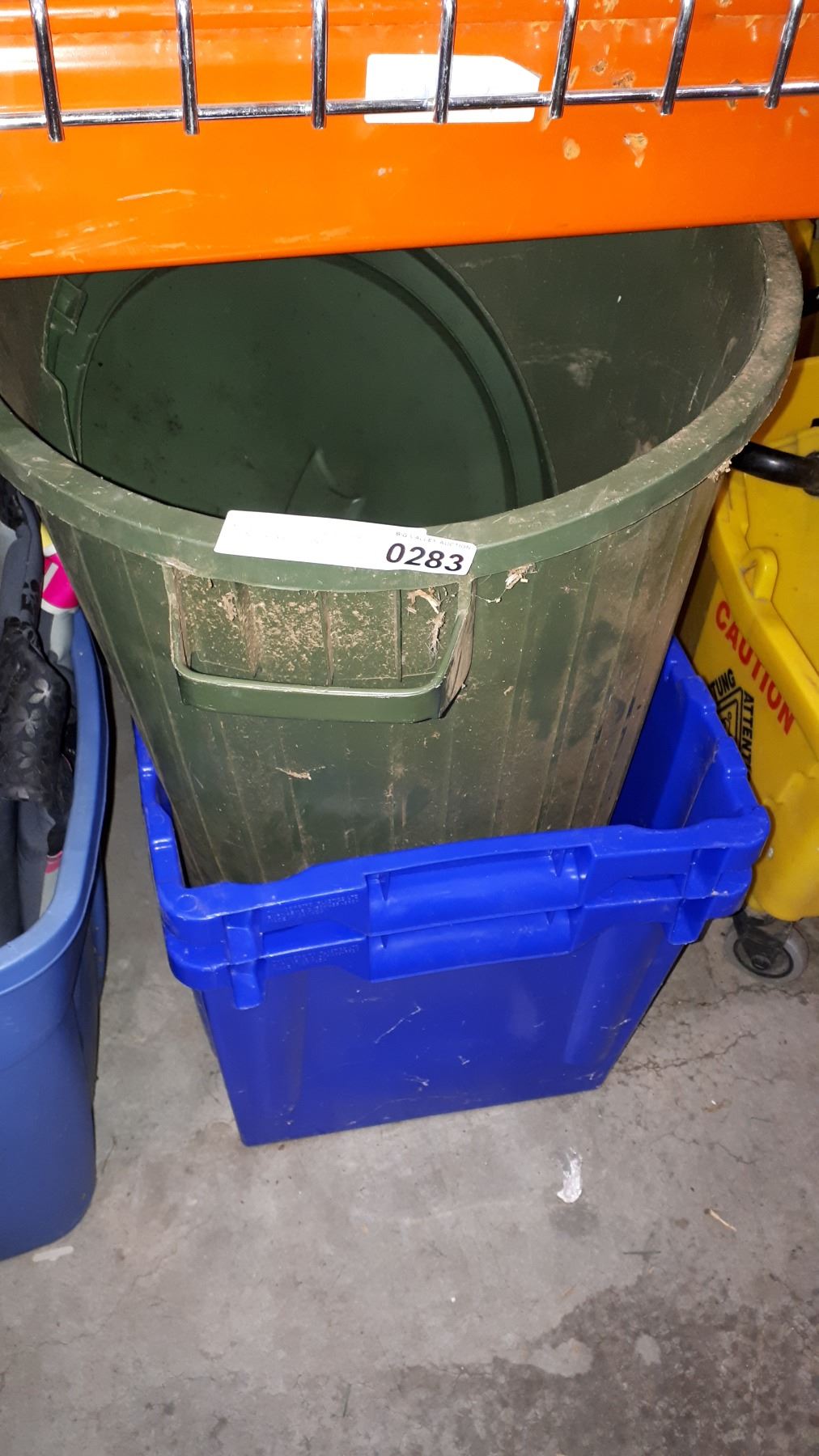 TWO BLUE RECYCLE BINS AND GREEN GARBAGE CAN