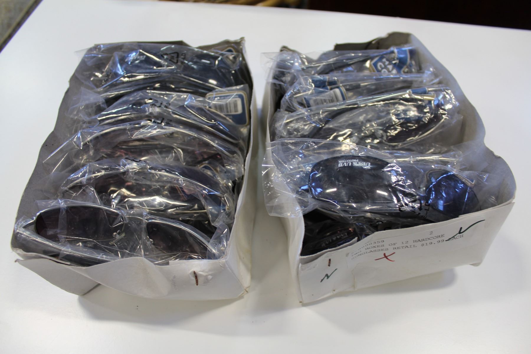 TWO BOXES OF 12 HARDCORE SUNGLASSES RETAIL $19.99 EACH