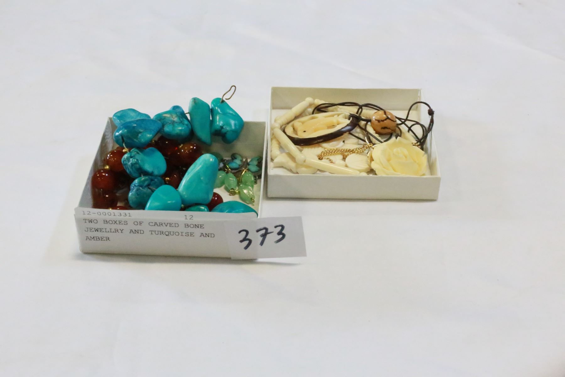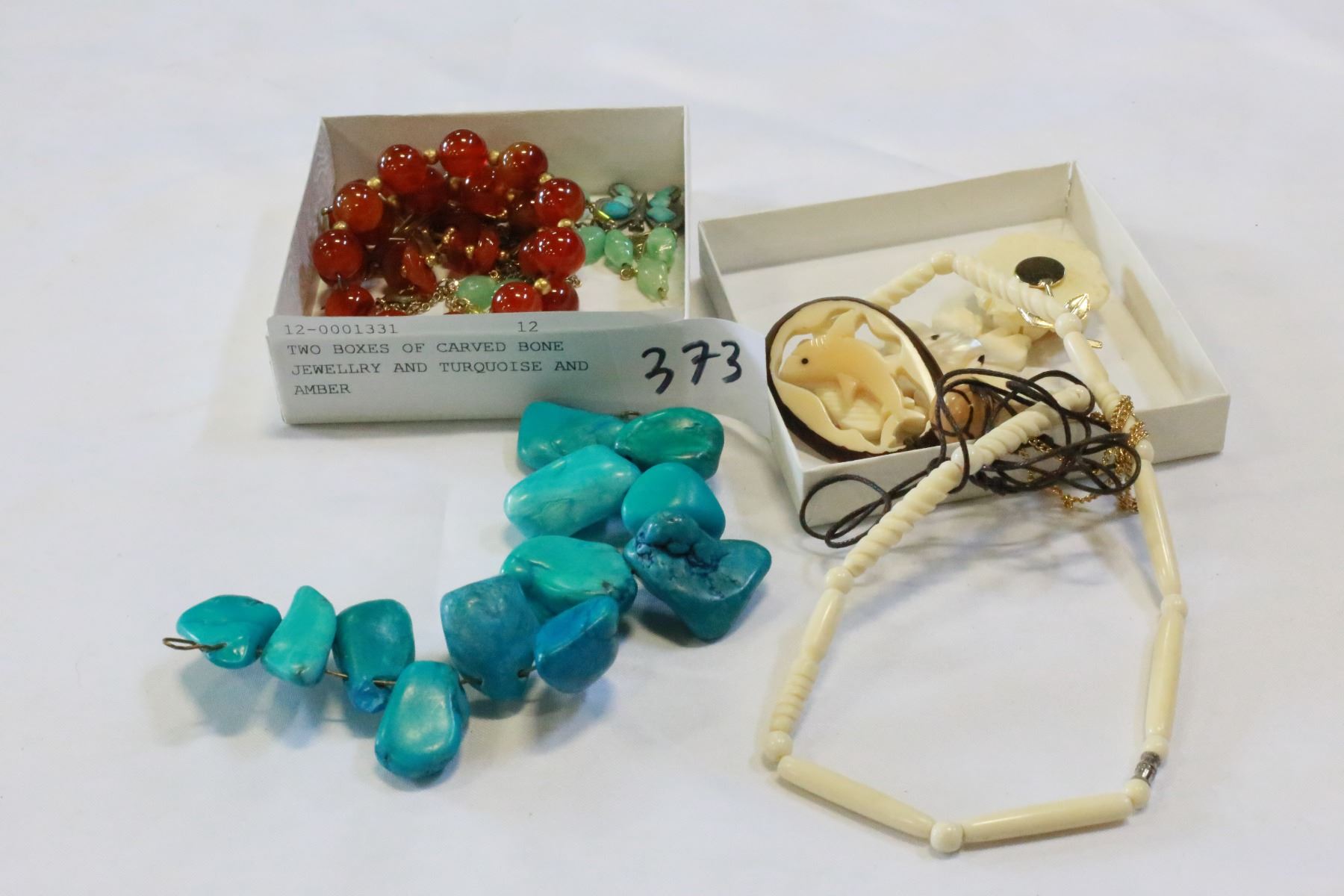 TWO BOXES OF CARVED BONE JEWELLRY AND TURQUOISE AND AMBER
