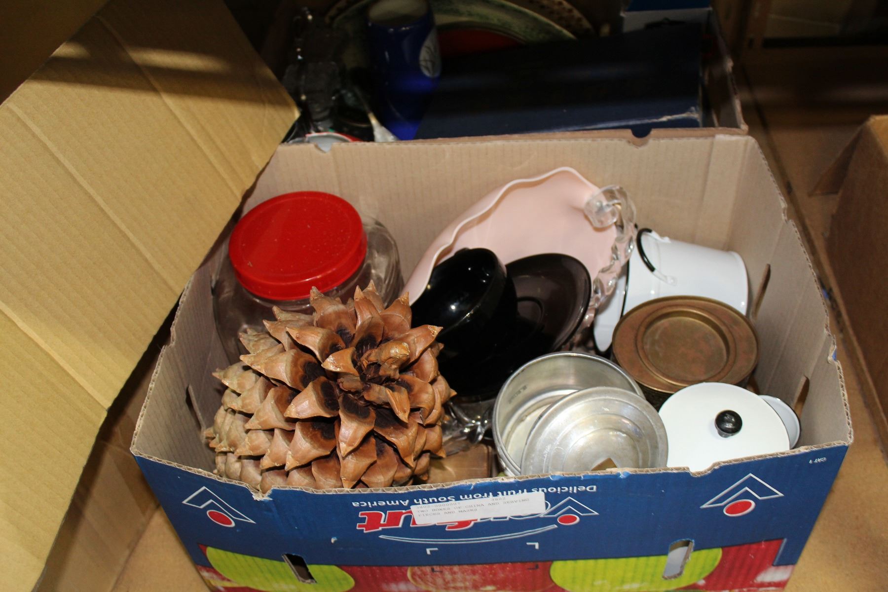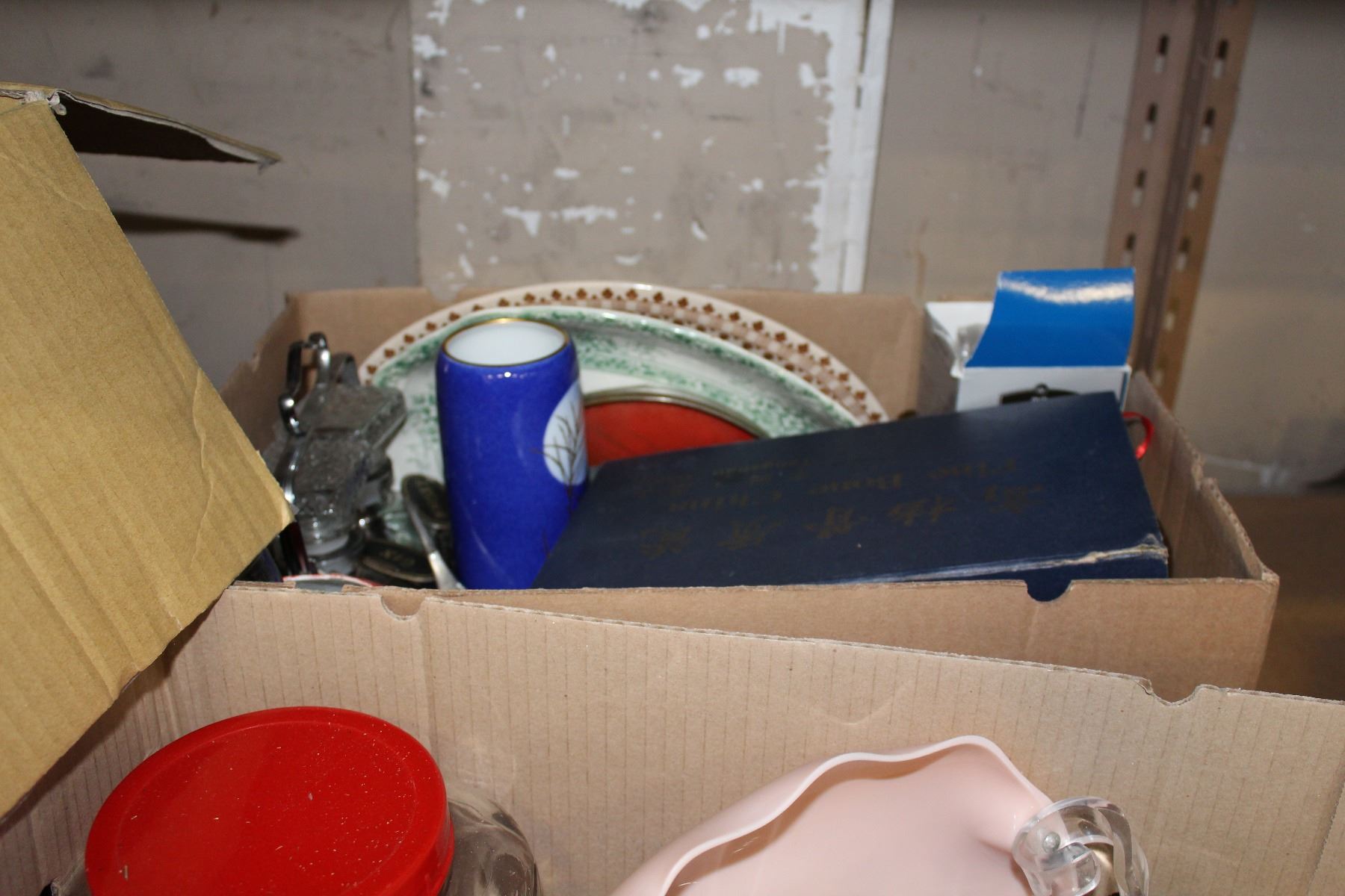 TWO BOXES OF CHINA AND SERVING PIECES AND MASKS