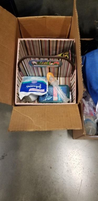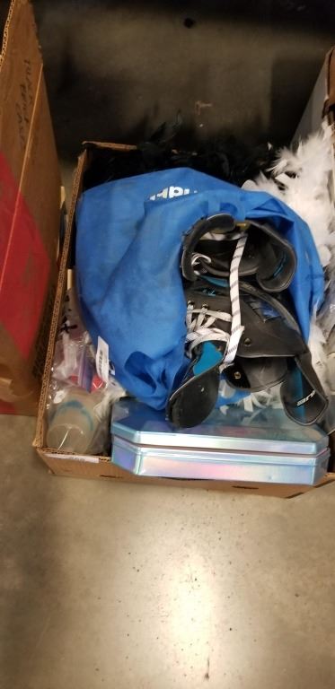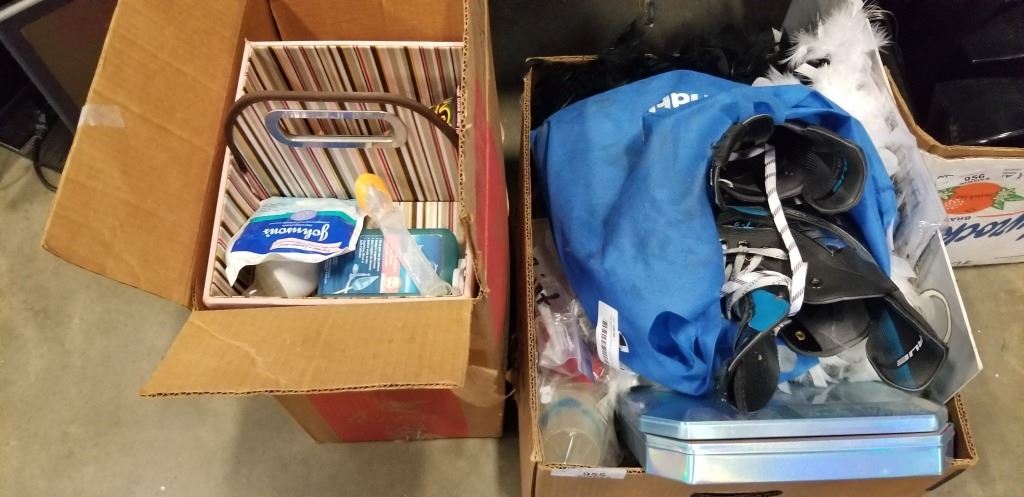 TWO BOXES OF ESTATE GOODS AND SIZE 10 ICE SKATES