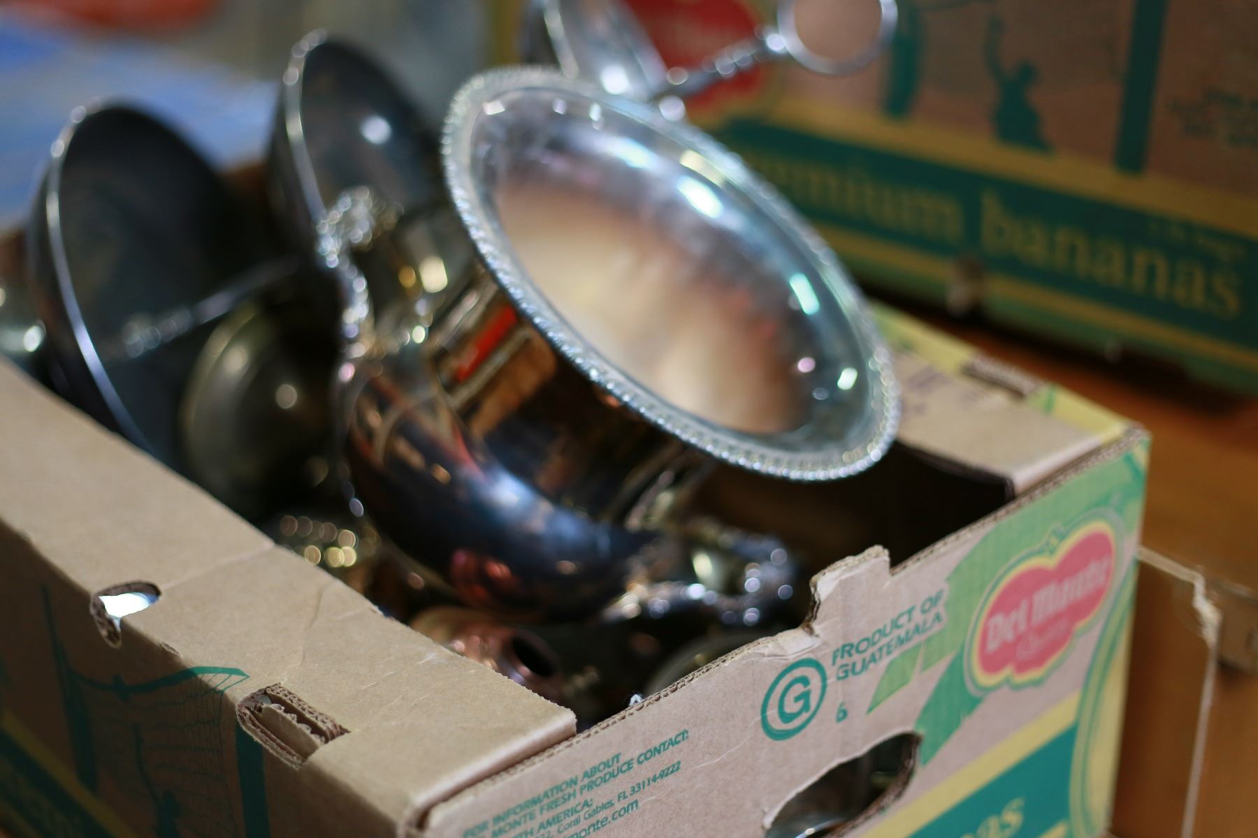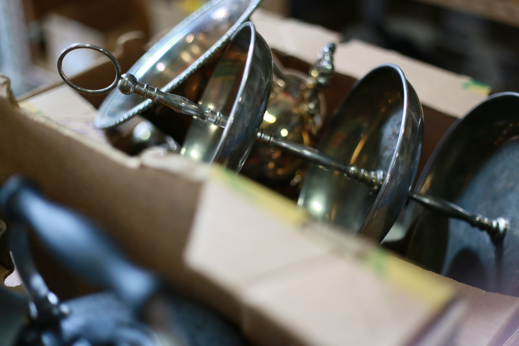 TWO BOXES OF ESTATE SILVER PLATE ETC
