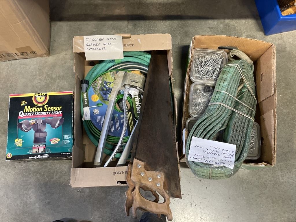 TWO BOXES OF HOSES, SPRINKLER AND TOOLS