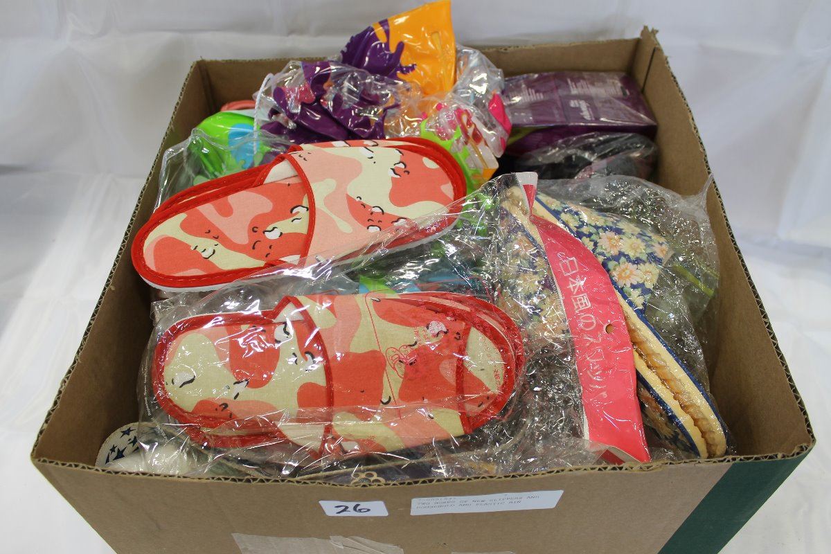 TWO BOXES OF NEW SLIPPERS AND HOUSEHOLD AND PLASTIC BIN