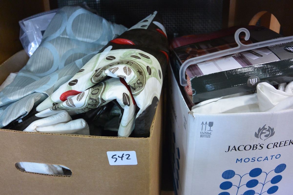 TWO BOXES OF NEW TABLE CLOTHS AND CURTAINS