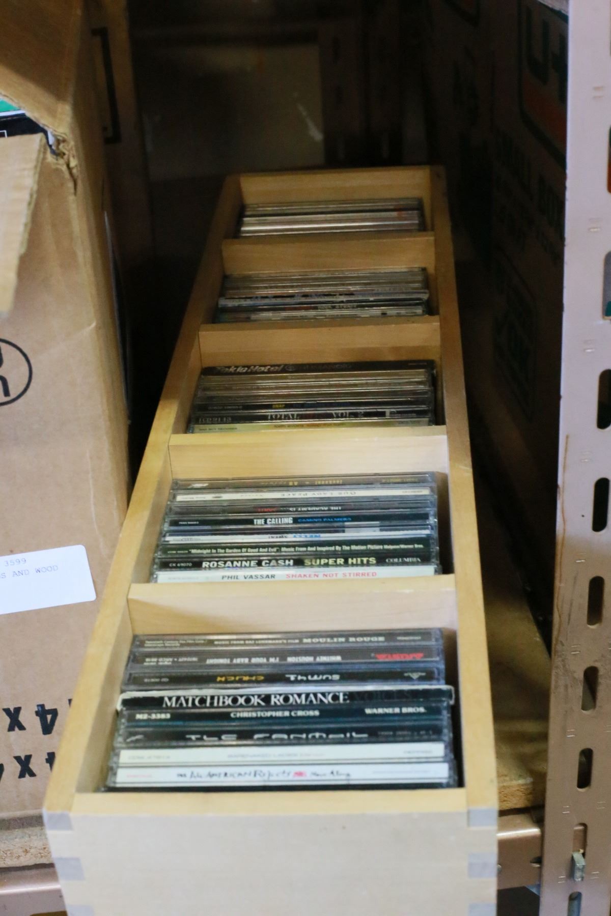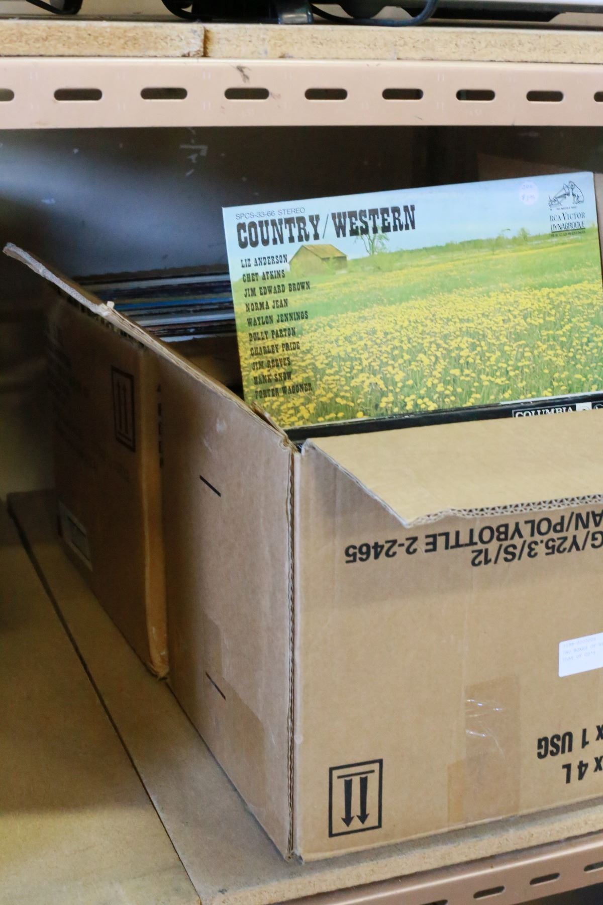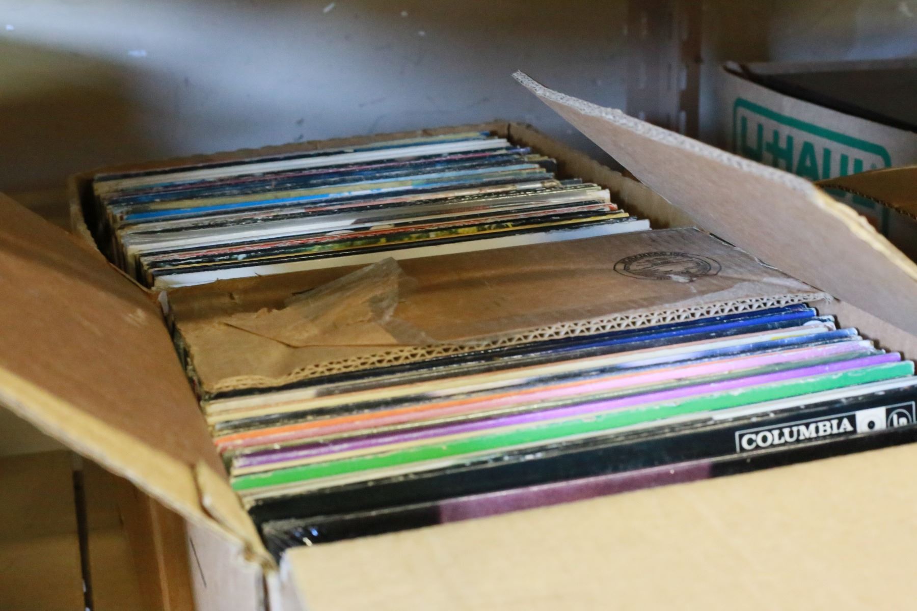 TWO BOXES OF RECORDS AND WOOD TRAY OF CDS