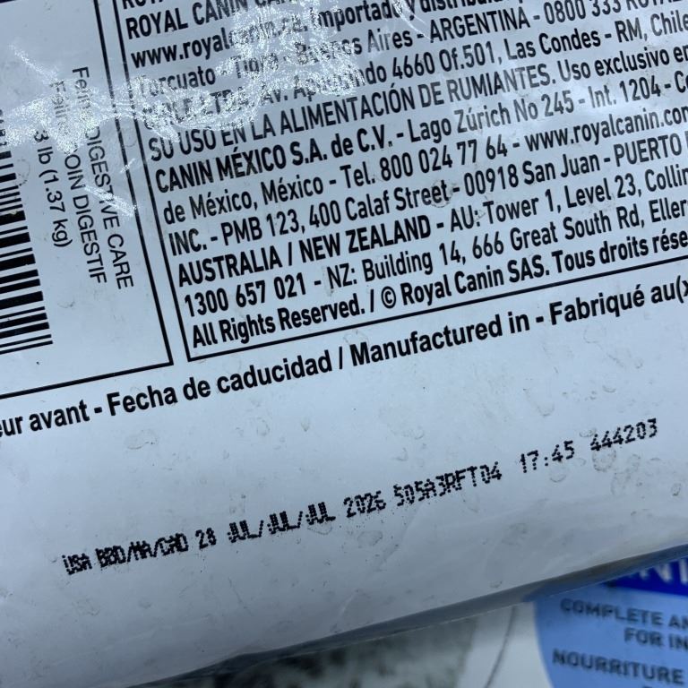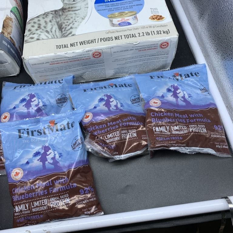 TWO BOXES OF ROYAL CANIN WET CAT FOOD, TWO BAGS OF ROYAL CANIN AND GO SOLUTIONS DRY CAT FOOD, PACIFIC OCEAN FISH MEAL FOR CATS AND CHICKEN MEAL WITH BLUEBERRIES FOR CATS BEST BEFORE 2026