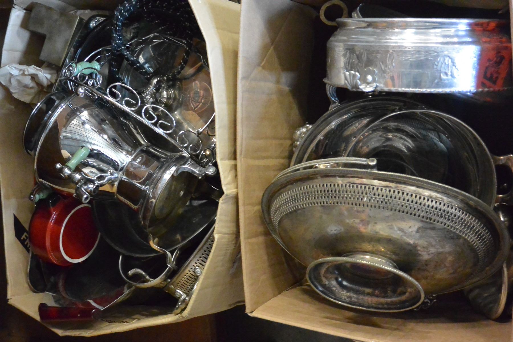 TWO BOXES OF SILVER PLATE AND METALWARE