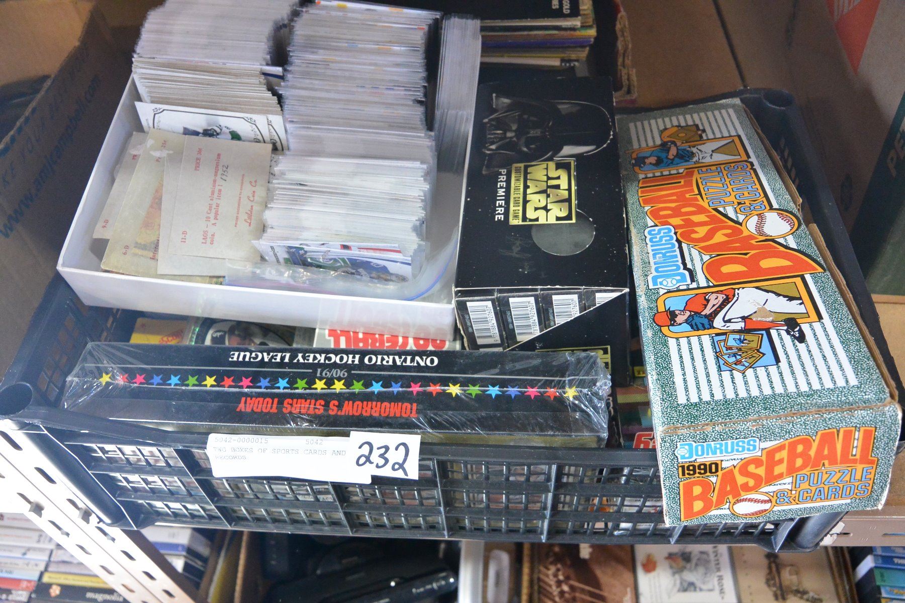 TWO BOXES OF SPORTS CARDS AND RECORDS