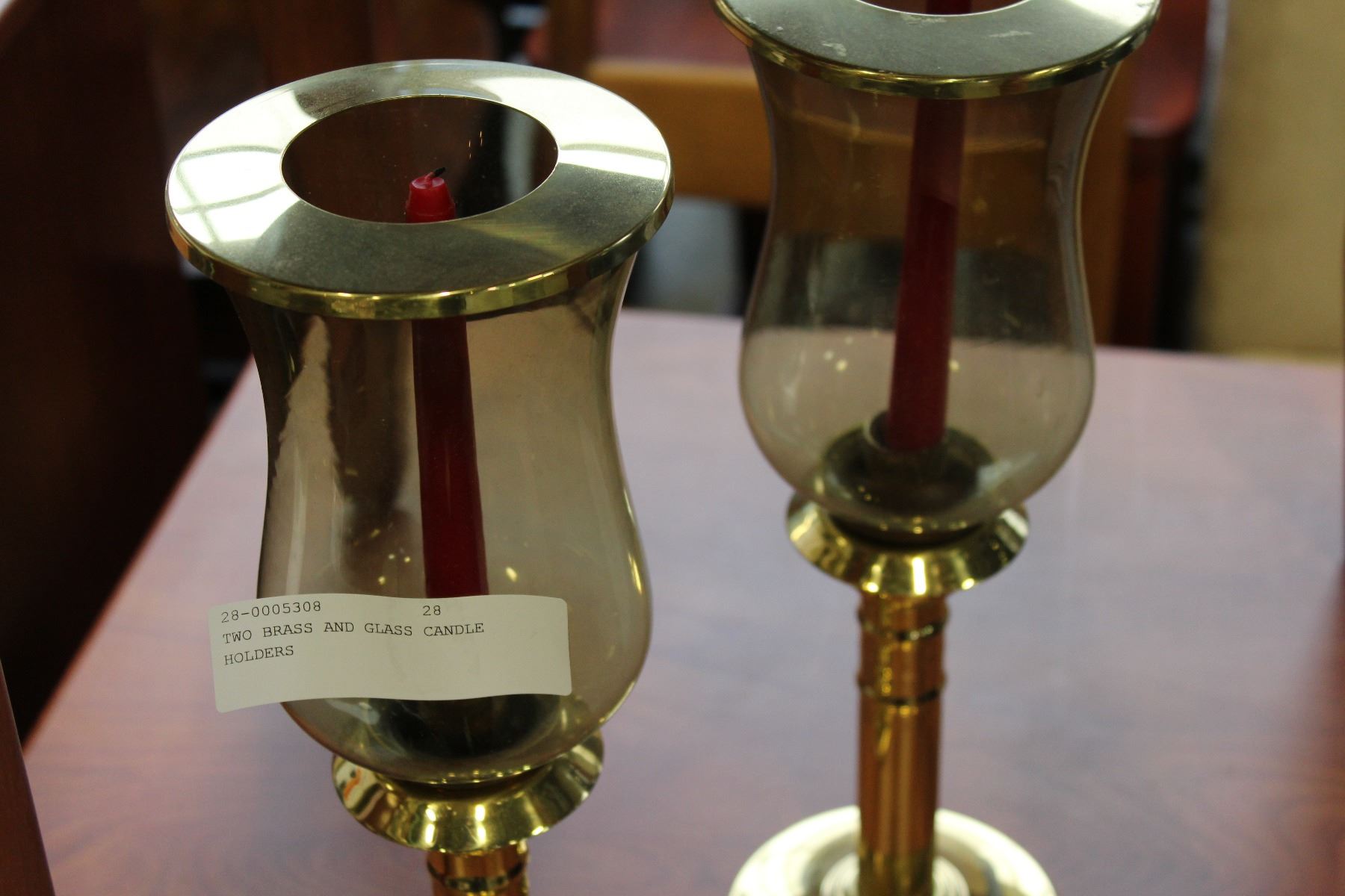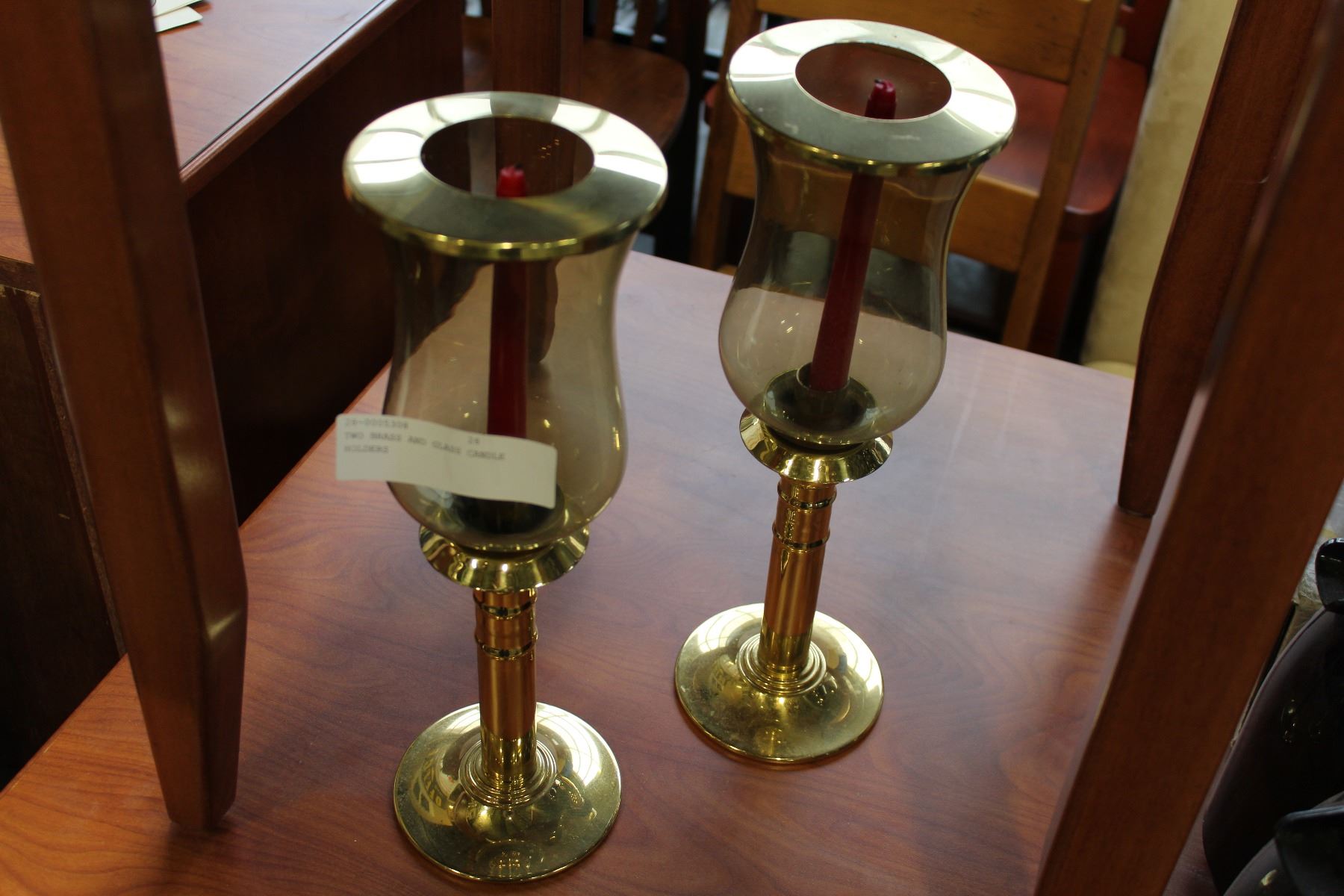 TWO BRASS AND GLASS CANDLE HOLDERS