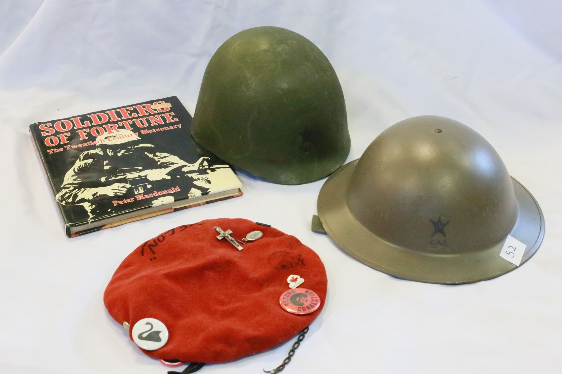 TWO CANADIAN WAR HELMETS BERET AND BOOK