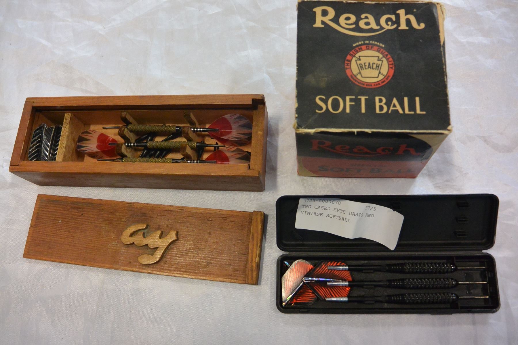 TWO CASED SETS DARTS AND VINTAGE SOFTBALL