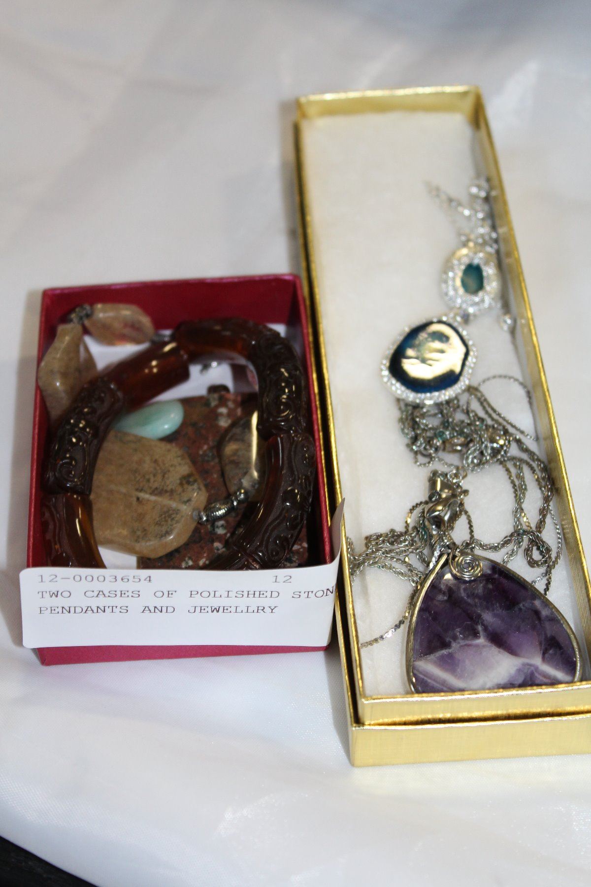 TWO CASES OF POLISHED STONE PENDANTS AND JEWELLRY