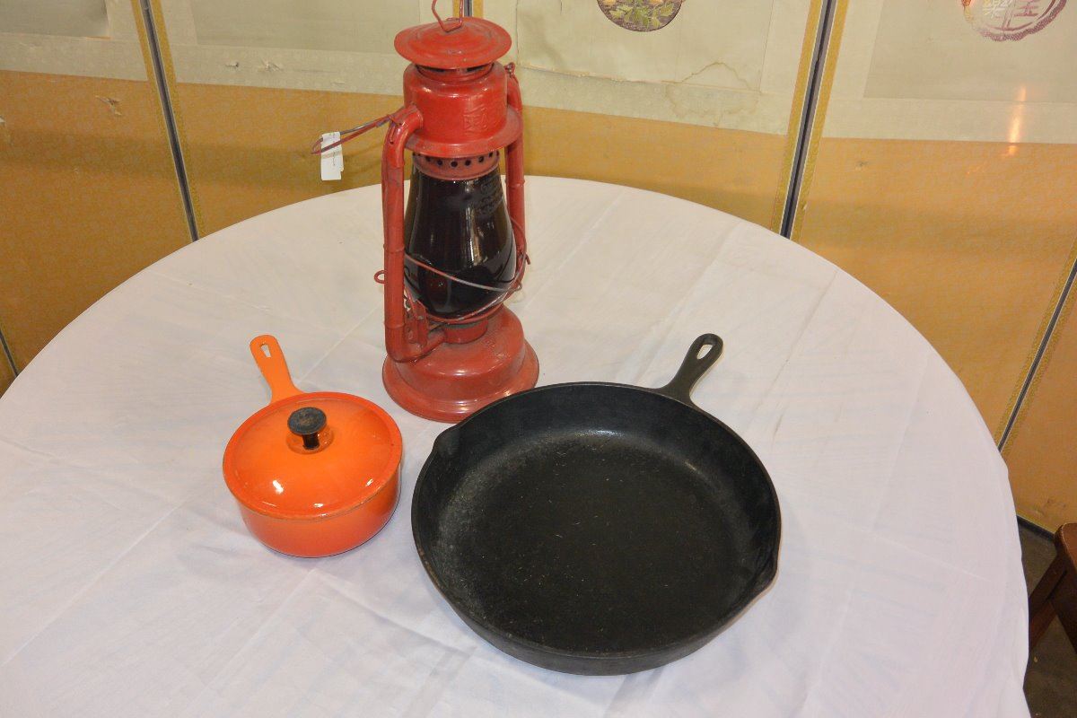 TWO CAST IRON PANS AND BEACON HURRICANE LANTERN