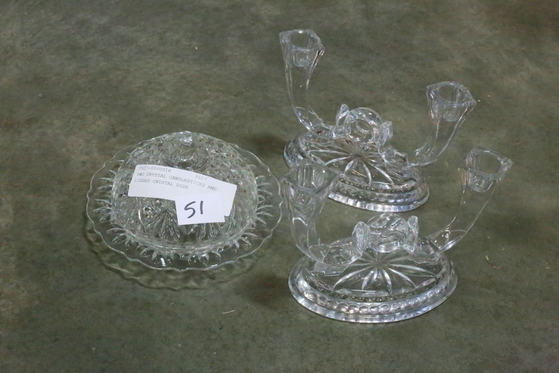 TWO CRYSTAL CANDLESTICKS AND LIDDED CRYSTAL DISH