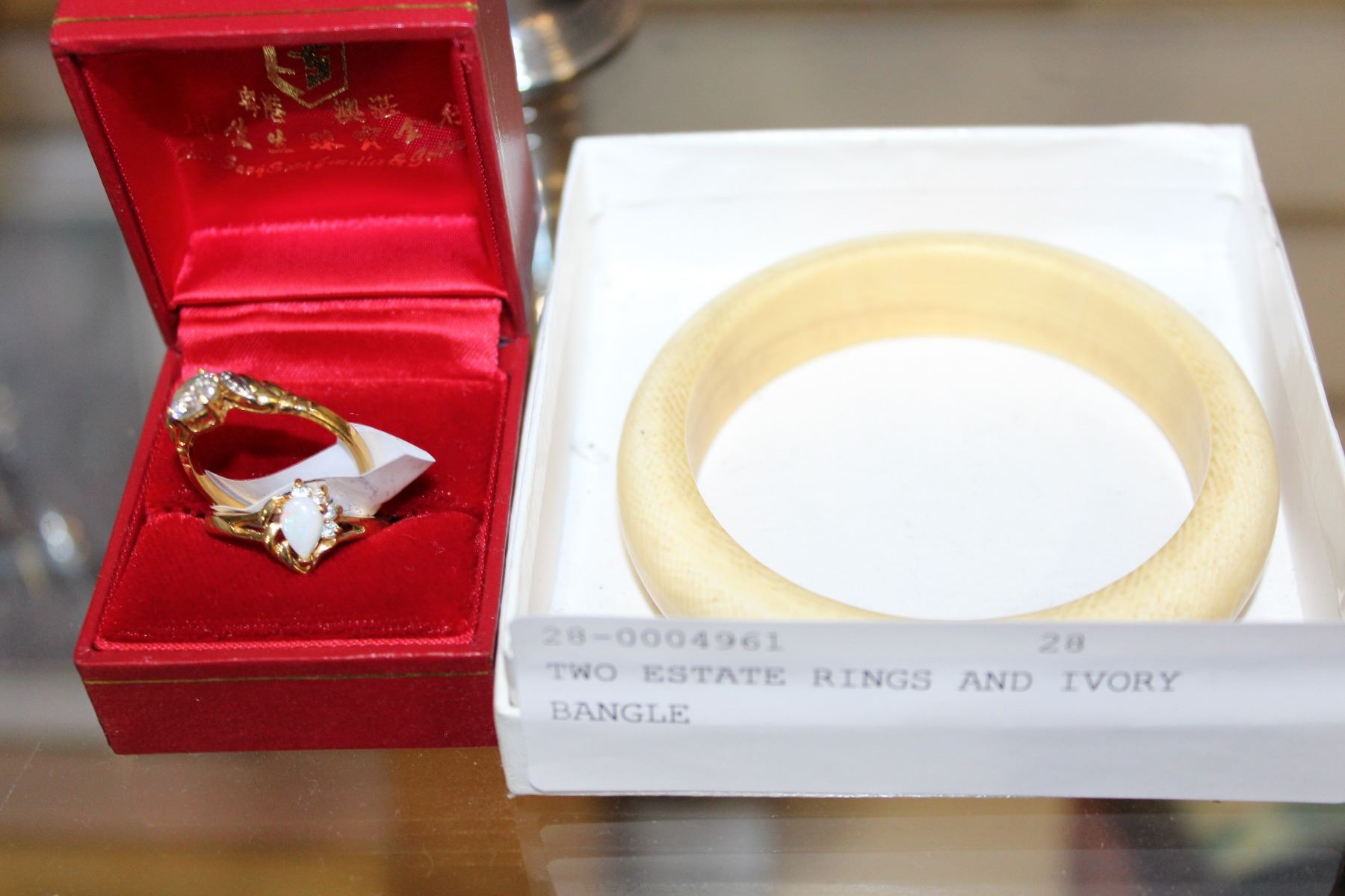 TWO ESTATE RINGS AND IVORY BANGLE