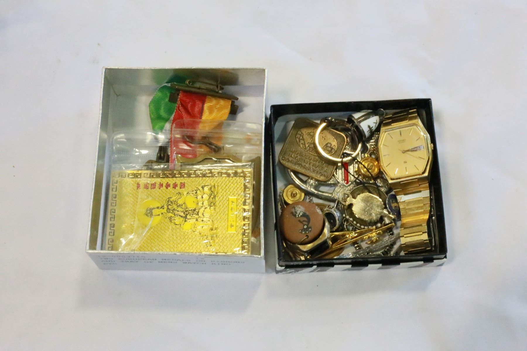 TWO EUROPEAN MEDALS ON RIBBONS AND TRAY OF MENS WATCH RING ETC